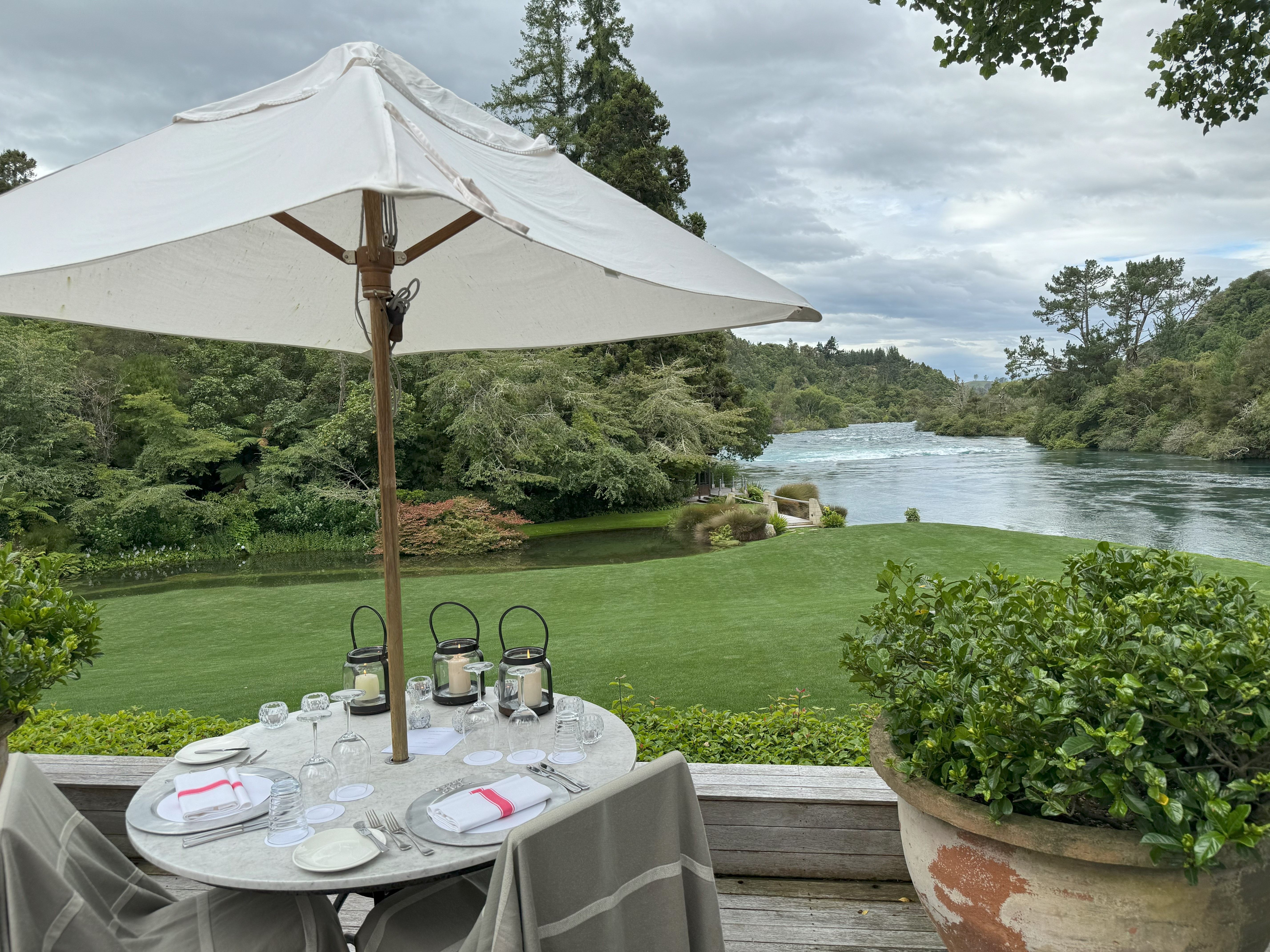 Back at Huka Lodge, we soaked our tired muscles in the hot tub before enjoying another gourmet meal, this time in a cozy alcove overlooking the river.