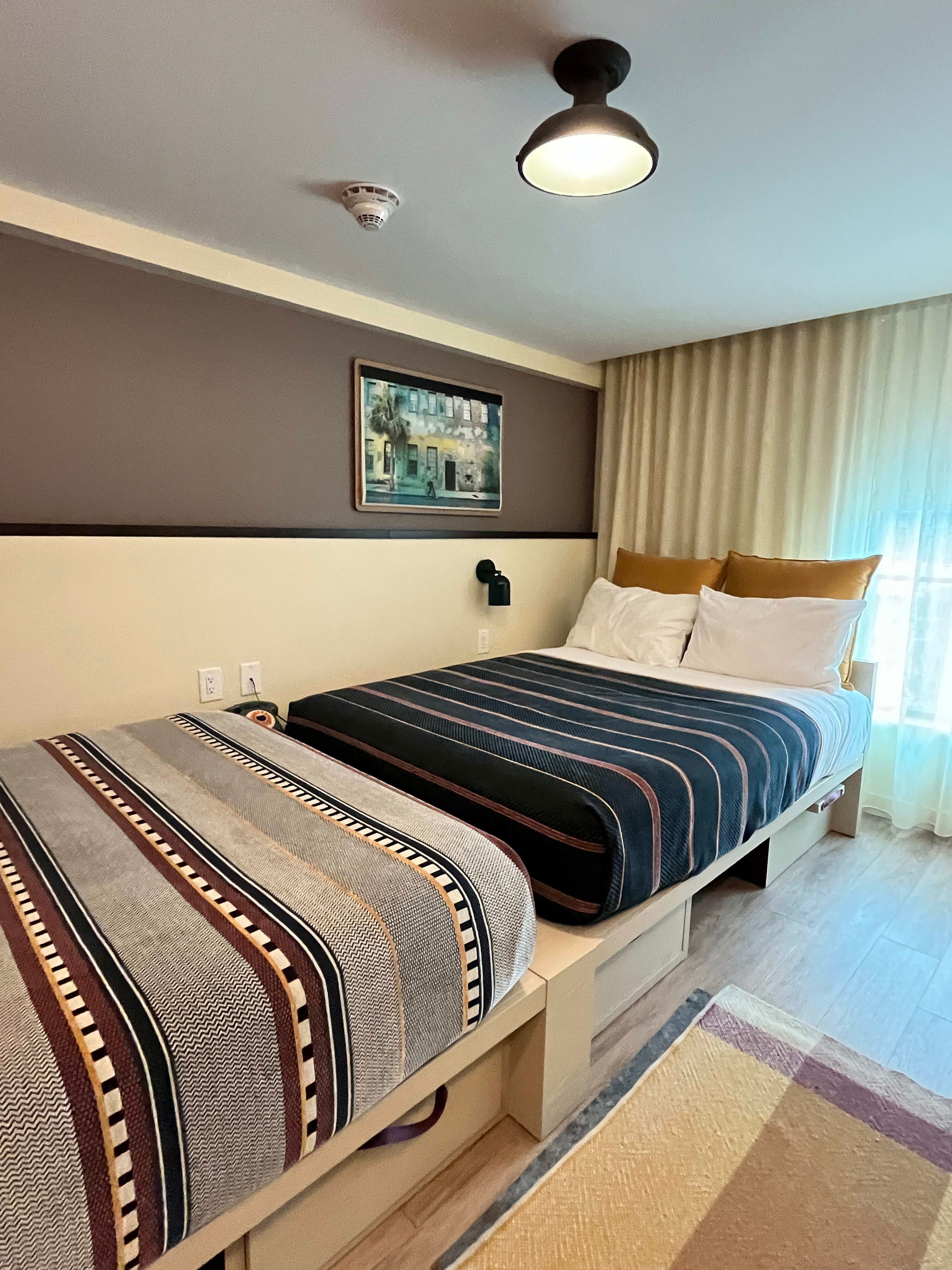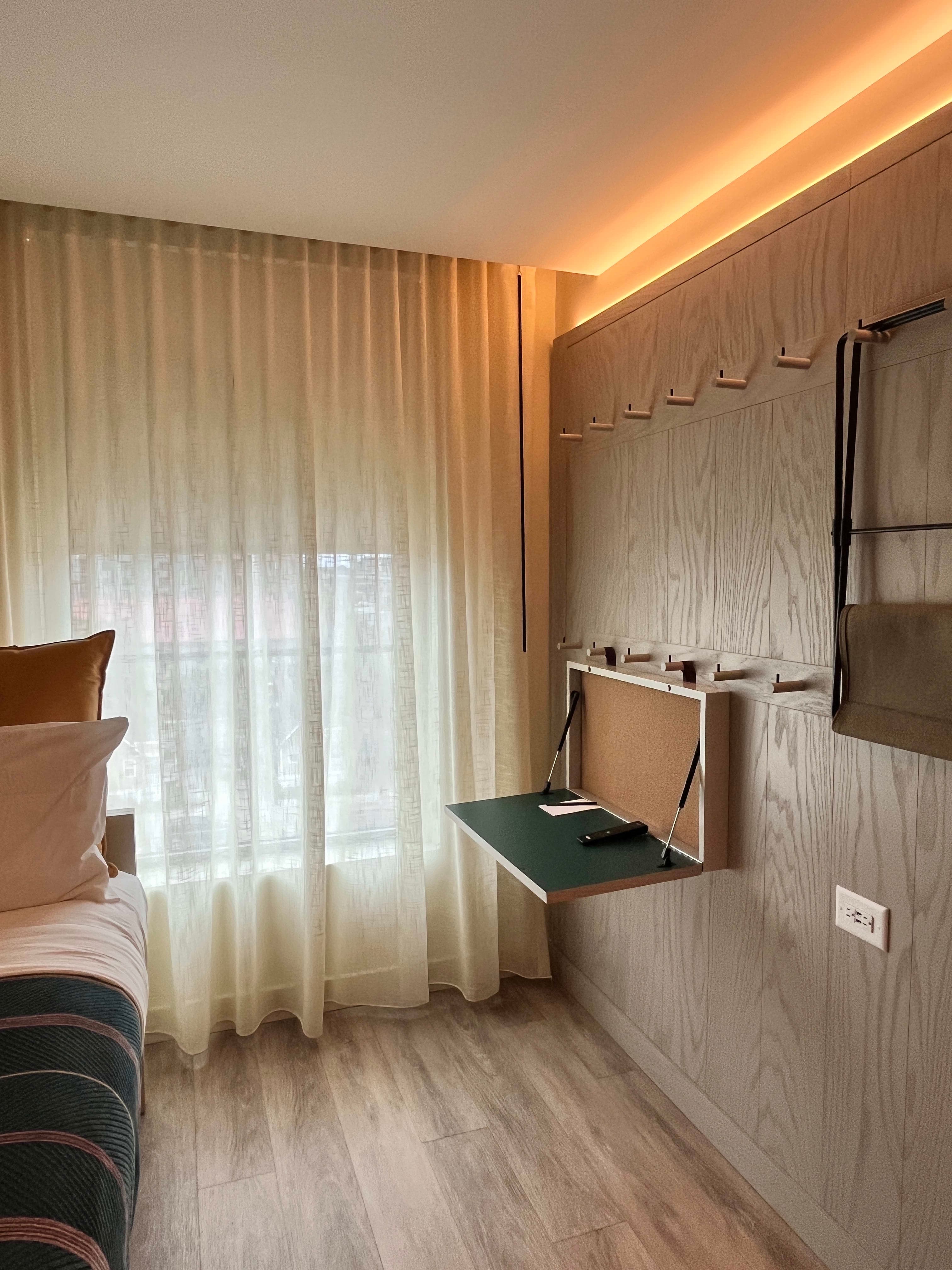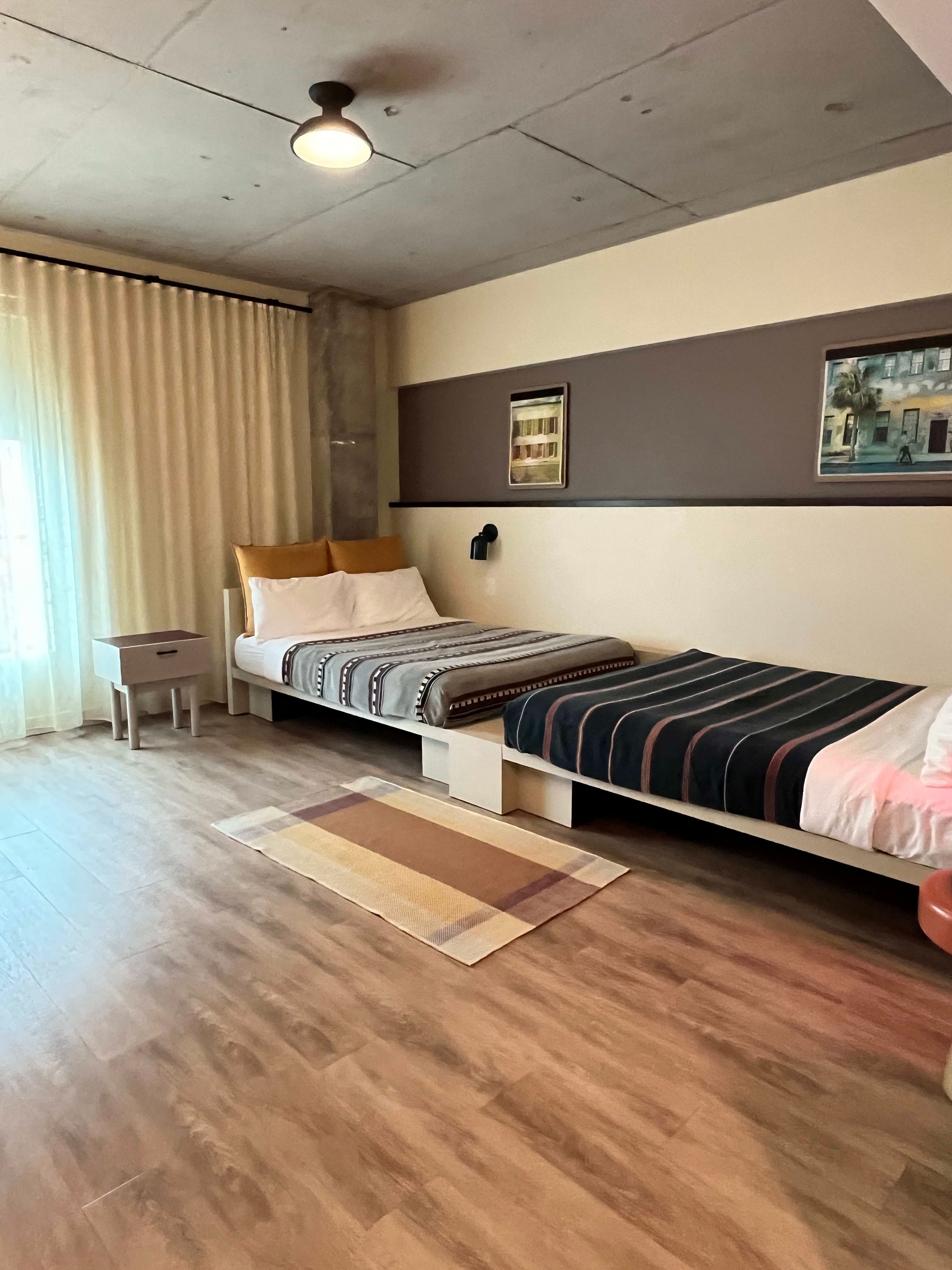 The best part of this hotel is how it can be so easily curated for groups. They offer quad-queen bunk rooms, which can sleep up to 8 people. Double-queen rooms, which can sleep up to 4 and corner king rooms. Each room has ample storage with pegs on the walls to use for hanging things and a fold-up desk with a seat that doubles as a suitcase holder. Each bedroom has their own steamer.