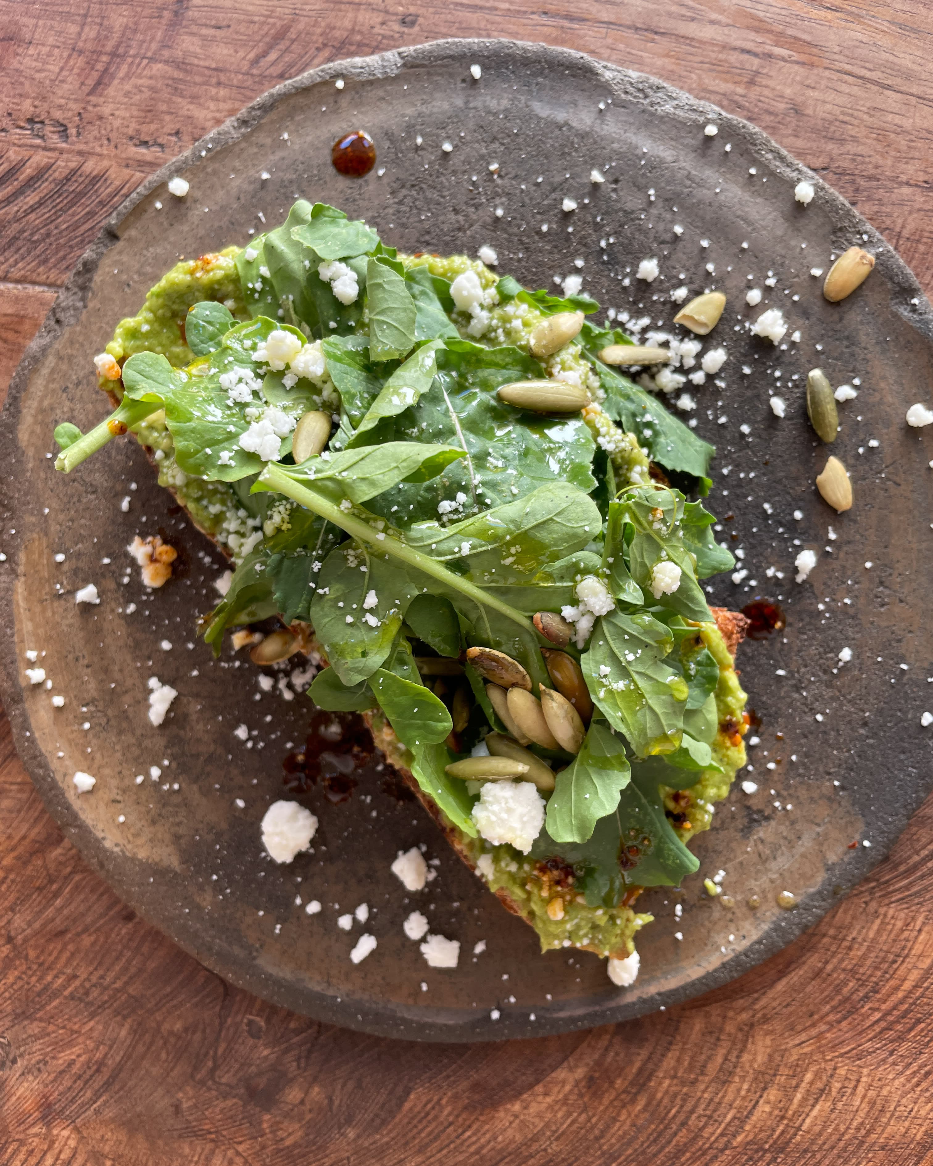 My order: nitro coffee and avocado toast with arugula, feta cheese, pumpkin seeds and salsa macha on sourdough bread