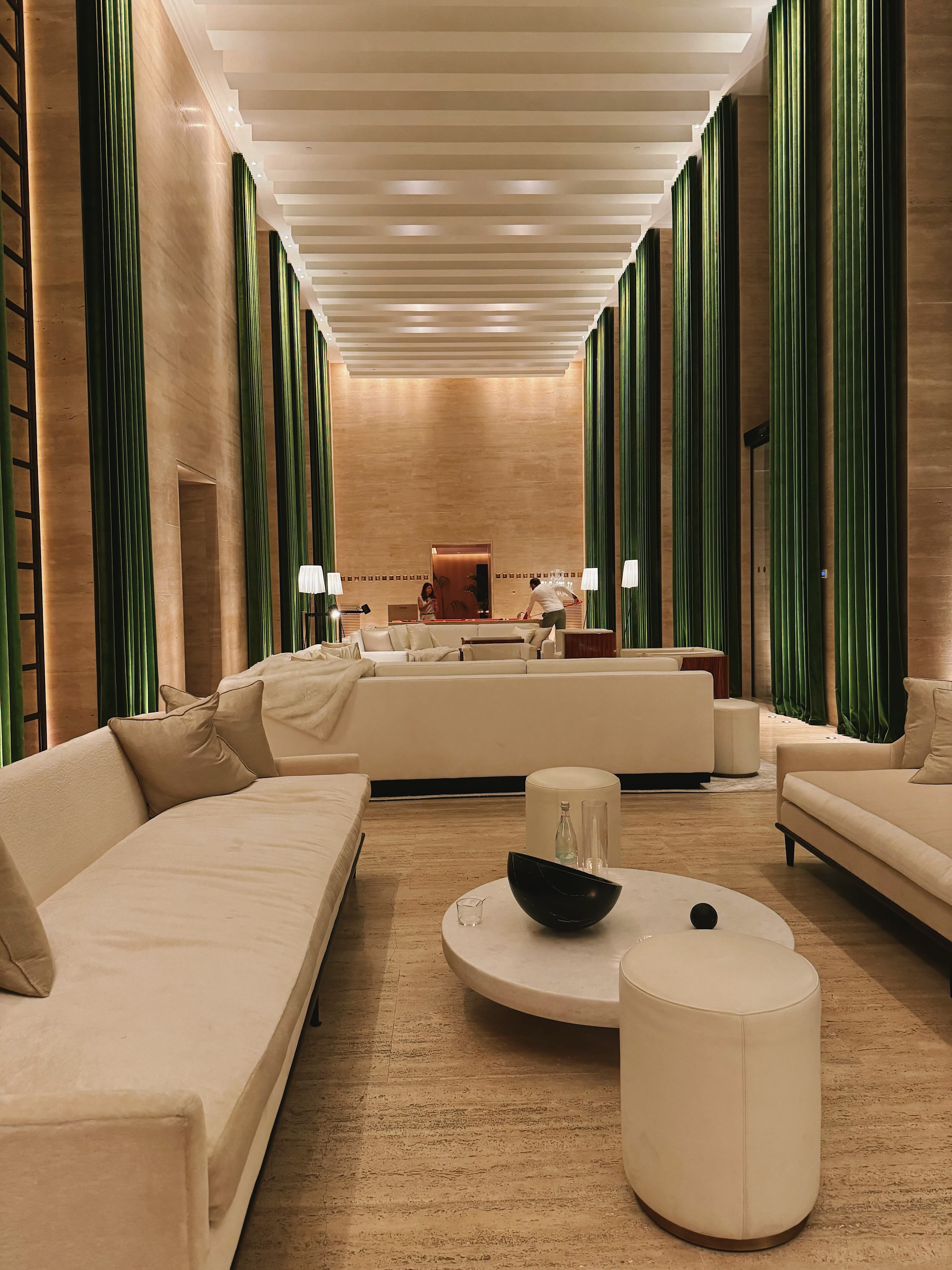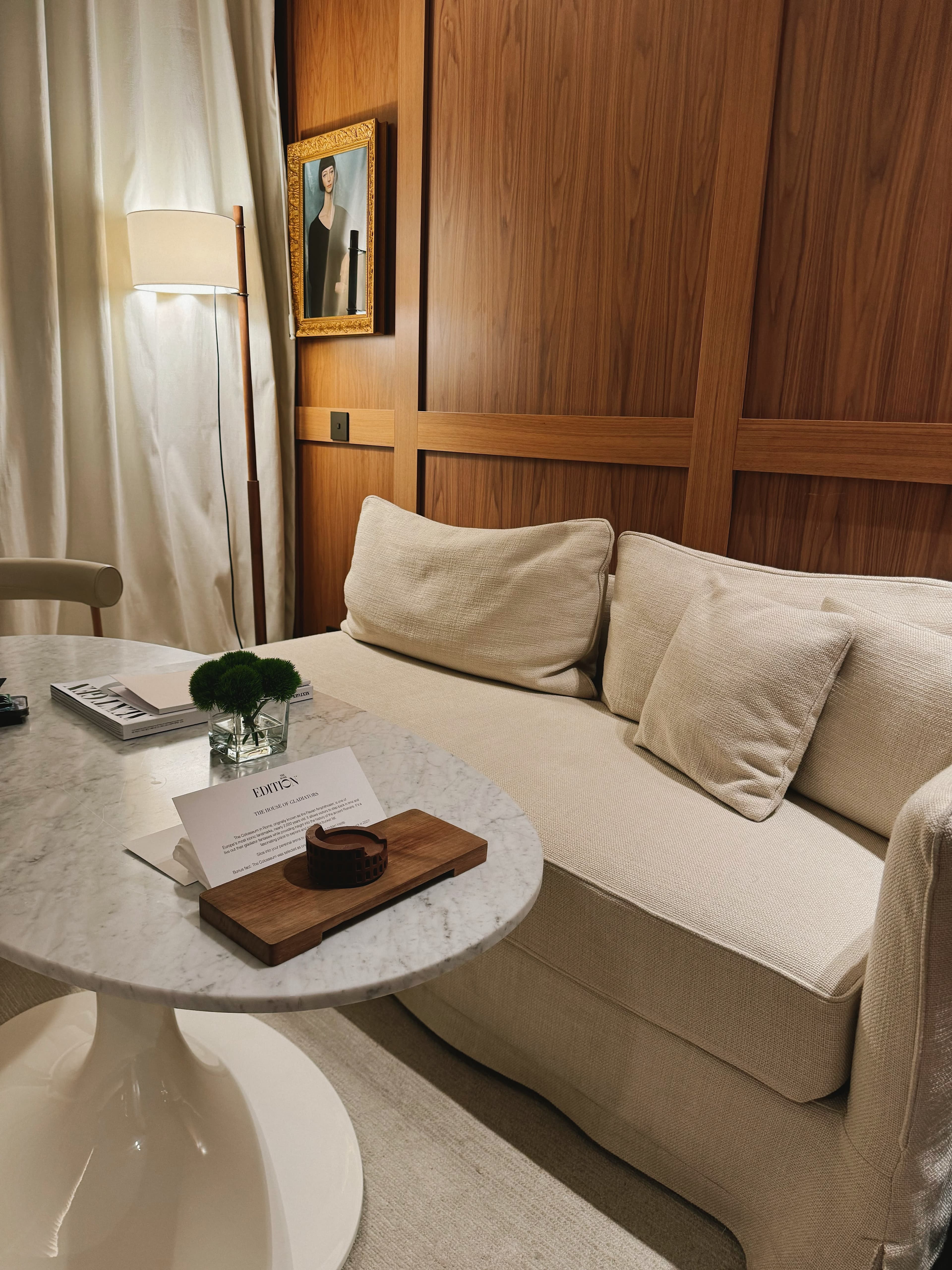 The Rome EDITION is tucked away on a small street with an unassuming facade. You are immediately transported into a lush oasis with a greenery-covered entrance and terrace. The high ceilings and coordinating colors of the lobby are particularly striking for those who appreciate the design of a hotel.