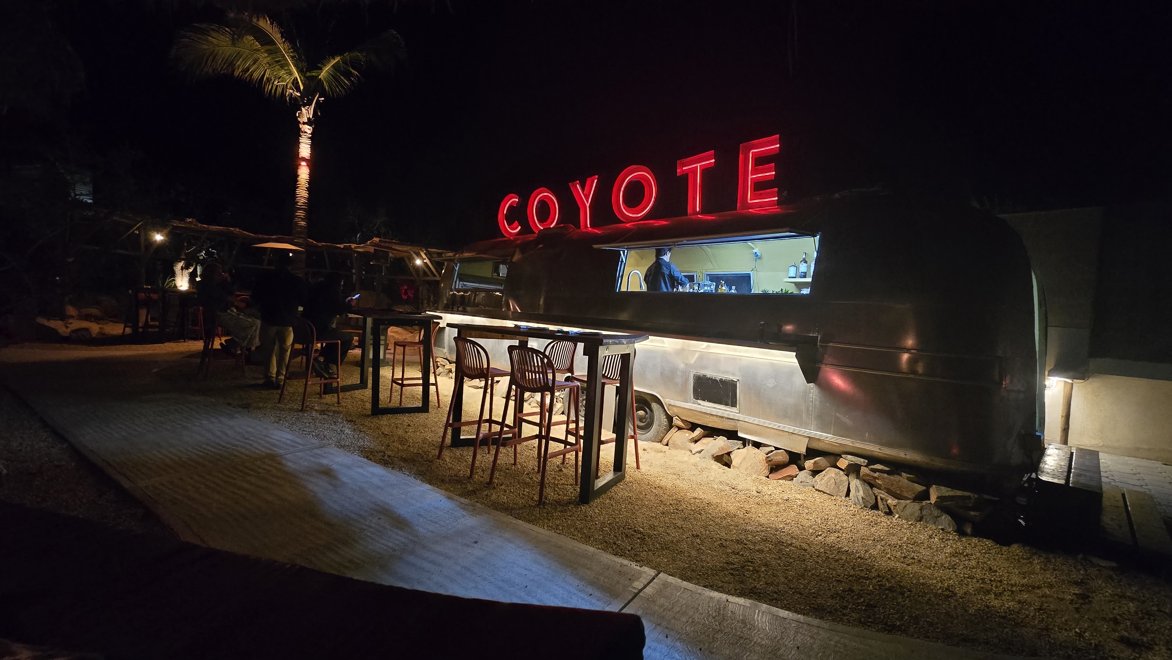 About 15 minutes south on the highway in El Pescadero, and worth every one of them. Live fire kitchen out of an Airstream, wood-burning pizza oven, open desert sky above you. Order the pork chop. Order the pizza. Order the strawberry margarita and settle in.