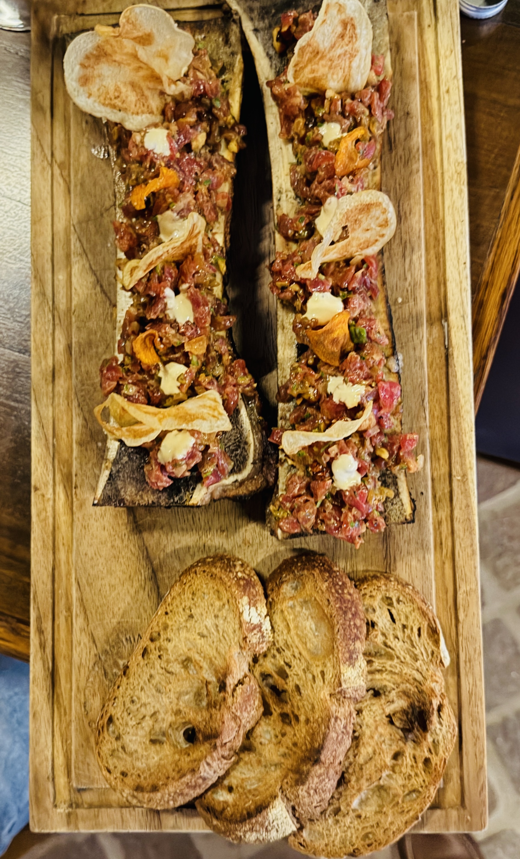 Terruno Restaurant at Vinedo Tres Raices: Roasted marrow bones and steak, charcoal-grilled bone marrow with steak tips in ancho chile marinade, served with handmade tortillas and salsa martajada.
