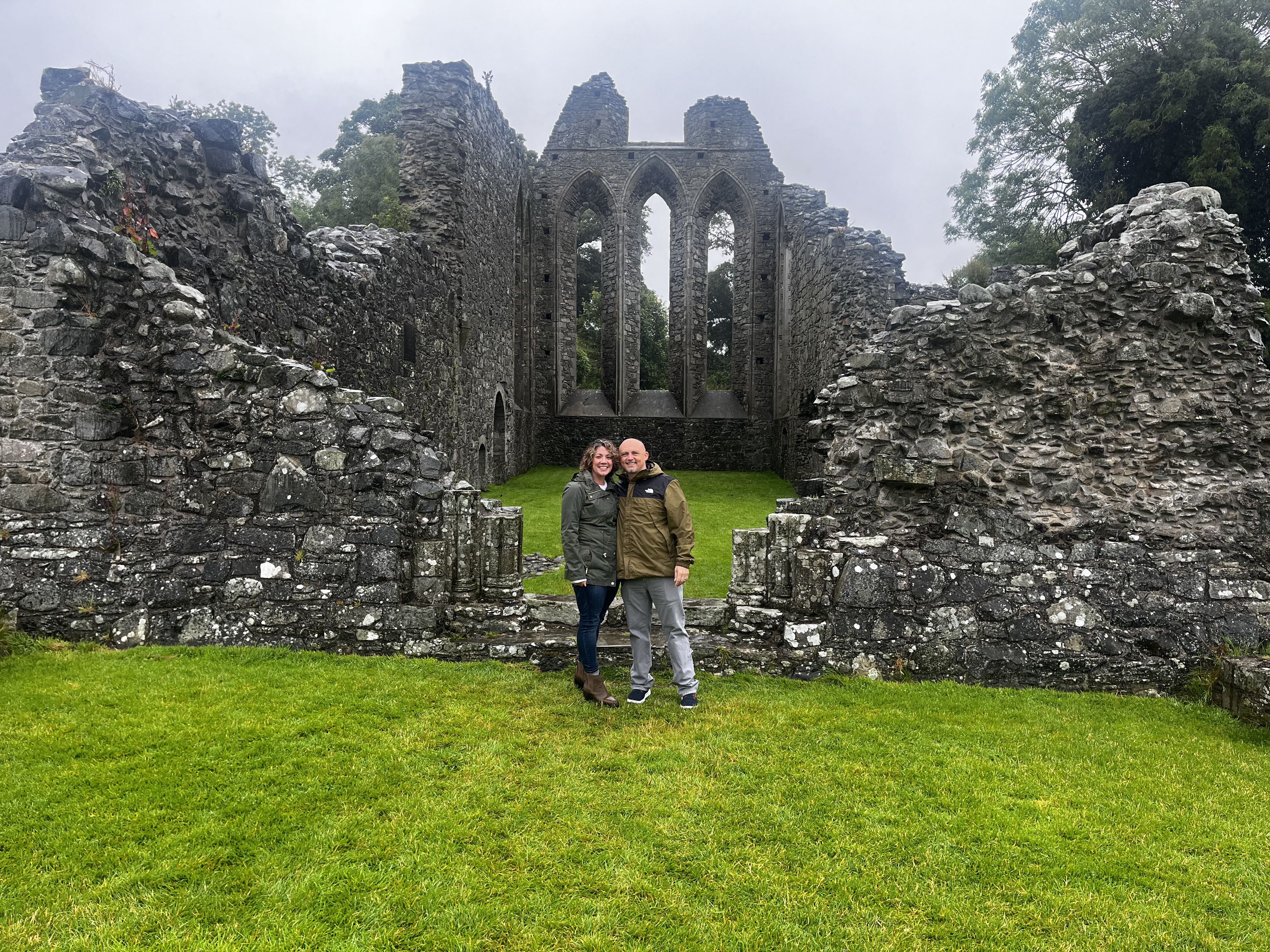 We continued on the A22 to Inch Abbey and spent some time wandering the grounds in the rain. There was only one other soul there, a local man with his spaniel. We chatted for quite some time about his life there and the history of the abbey. He kindly took a few photos for us, so we didn’t have to selfie them all and said, “Slán go fóill” (Goodbye for now).