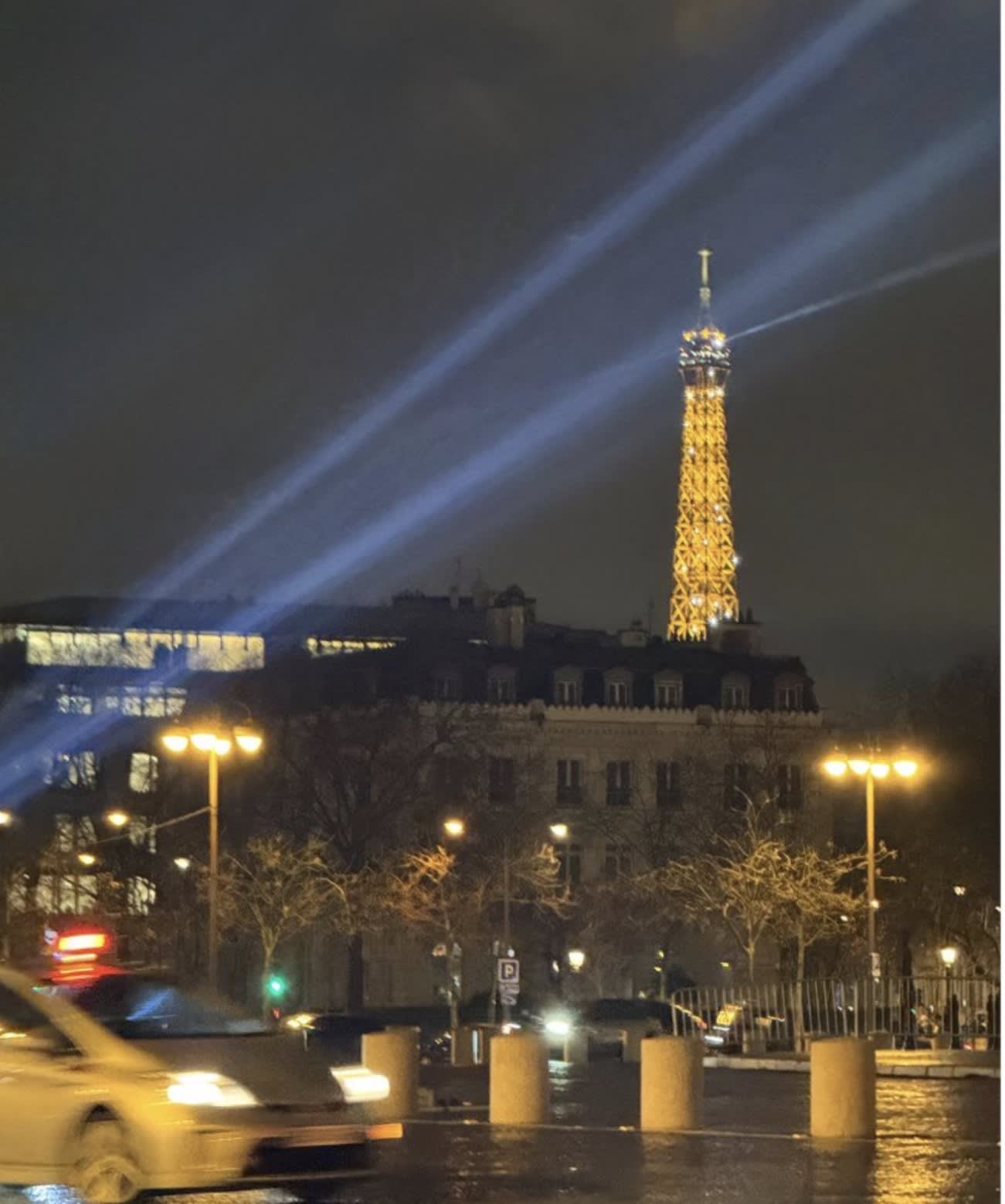 The Eiffel Tower sparkling at night, as viewed from the roundabout at the Arc de Triomphe.