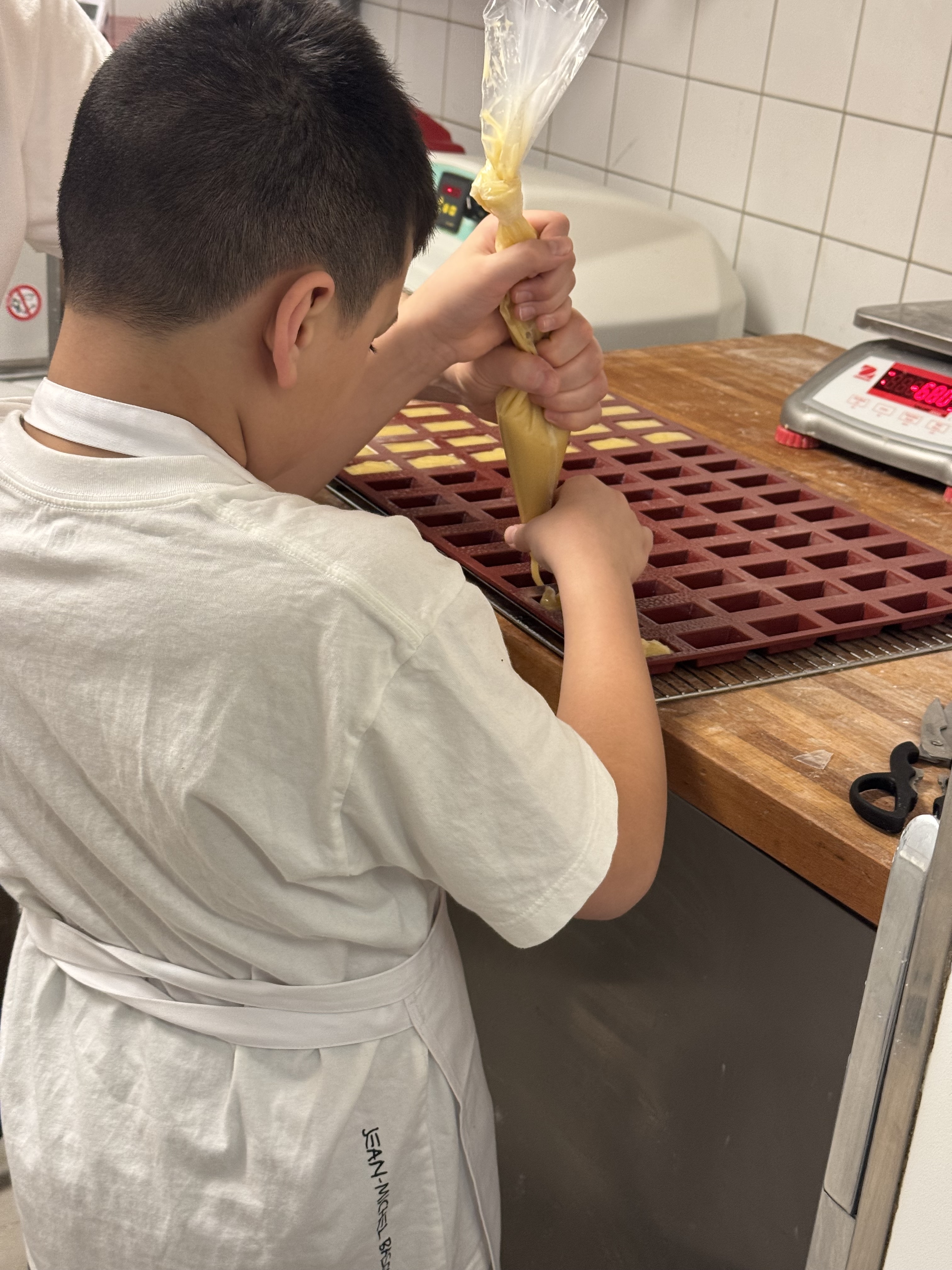 My 10-year-old son, learning how to hold the piping bag and make financiers at our small group baking class.
