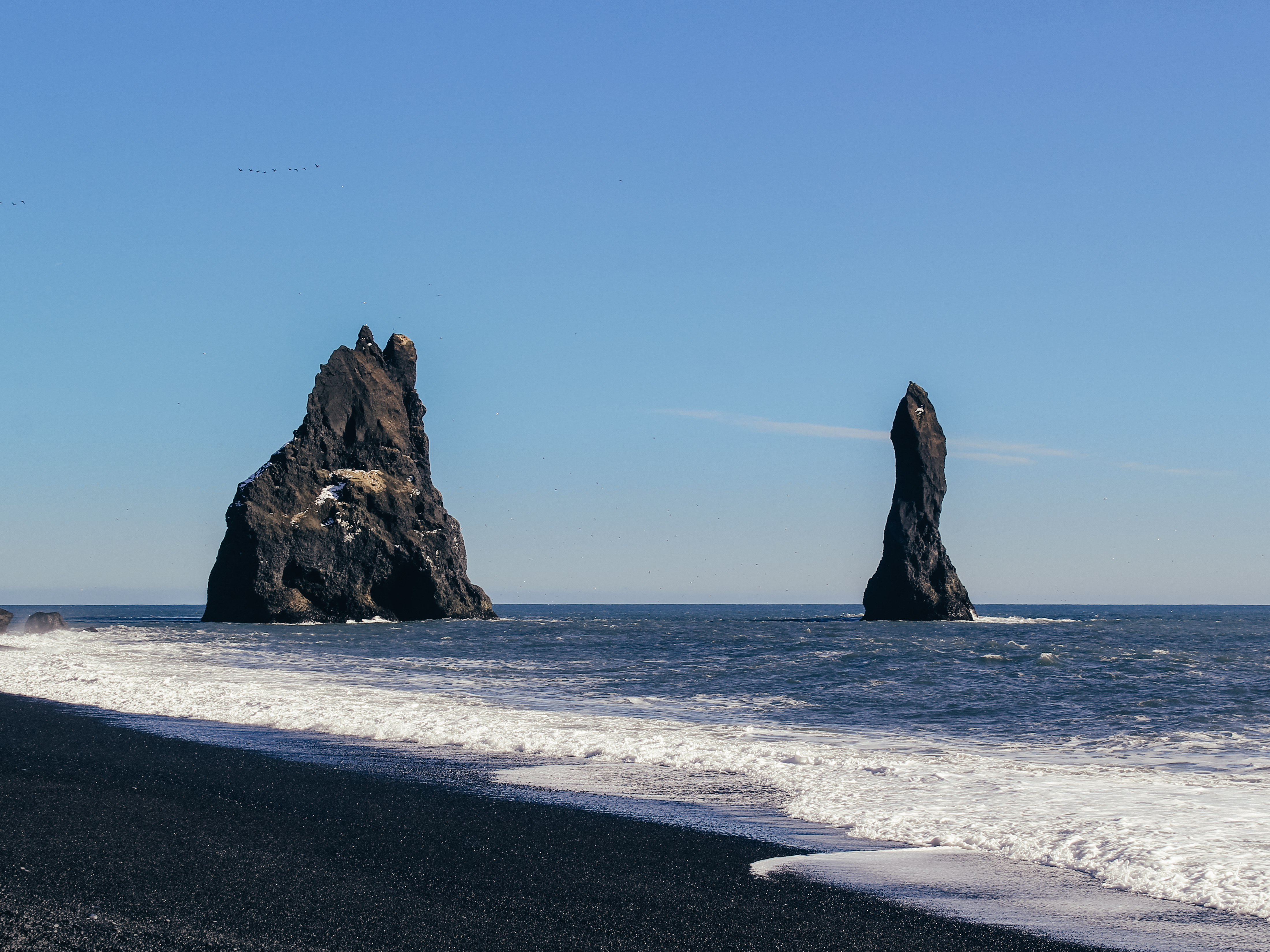 Continue to Dyrhólaey, a dramatic headland offering sweeping views over the coastline, before visiting Reynisfjara, the famous black-sand beach framed by basalt columns and sea stacks, and recognizable from Game of Thrones.