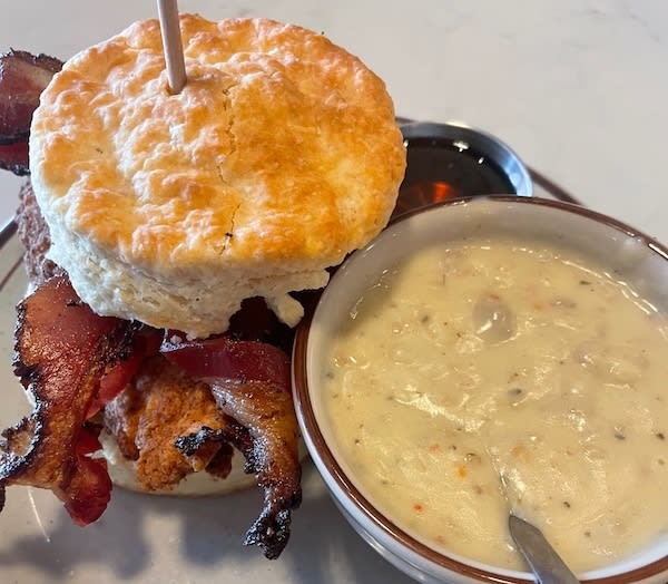 Denver Biscuit Company: There are three locations; I went to the one on the way from the airport into the city. Holy heavy lunch, but so worth it. Got the Lola—basically a breakfast fried chicken sandwich with bacon, maple syrup, and garlic honey butter on the flakiest, most buttery biscuit ever. The side of sausage gravy for dipping was perfectly seasoned, too.