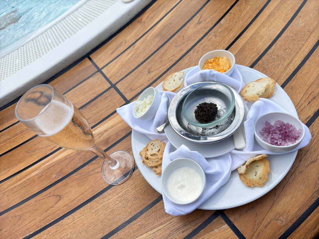 Seabourn doesn't exactly advertise this, but it's an open secret among those in the know: You can order caviar at any time, to anywhere on the ship, whether that's a lounge, a deck, your cabin, or, yes, one of the outdoor hot tubs. It arrives plated individually, with crackers, diced onion, sour cream, and all the trimmings. Order it with champagne. Again, it’s all included.