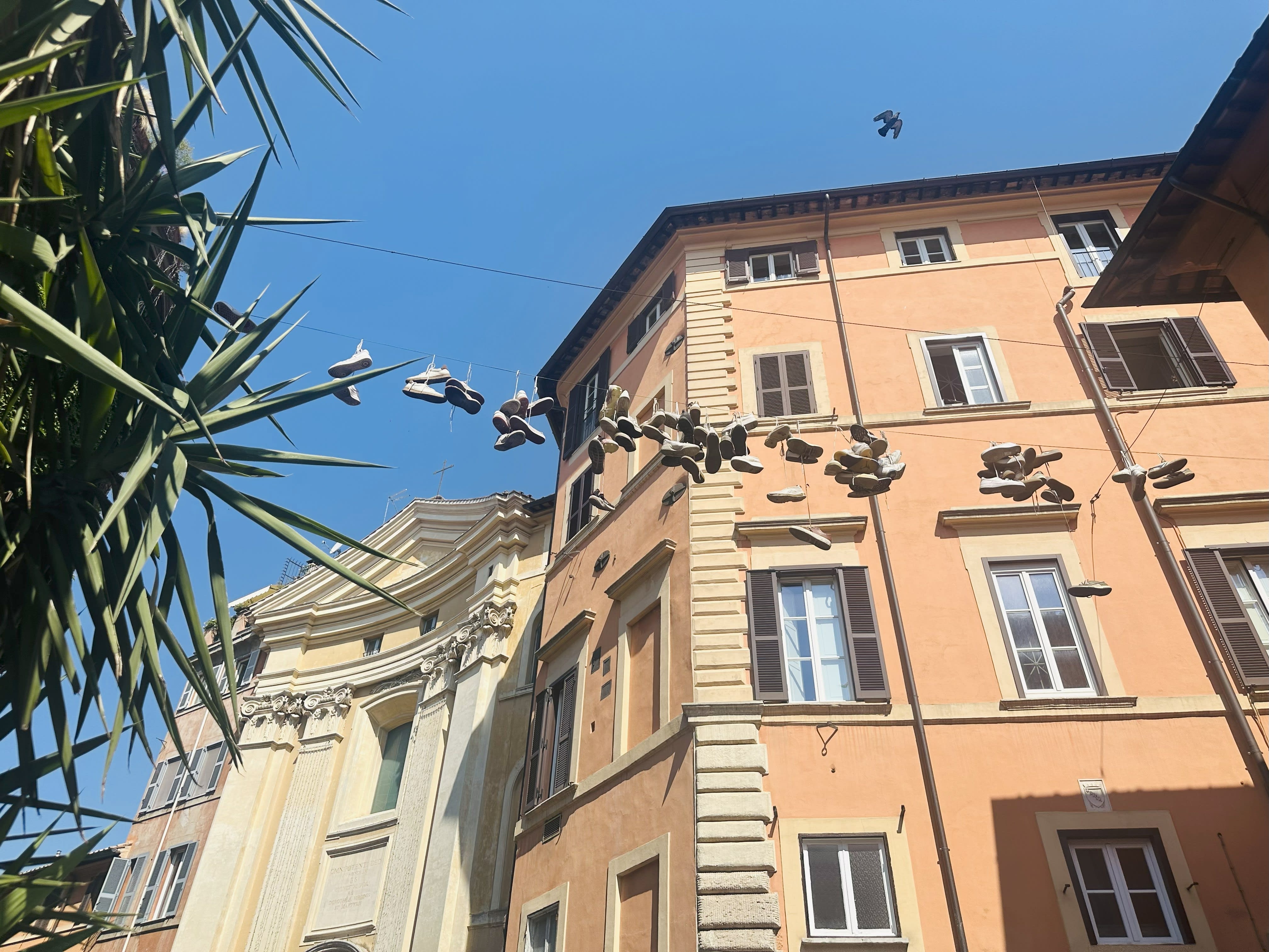Only in Trastevere: sneakers strung between ochre walls and baroque facades. A neighborhood where history and bohemian spirit meet in the most unexpected ways