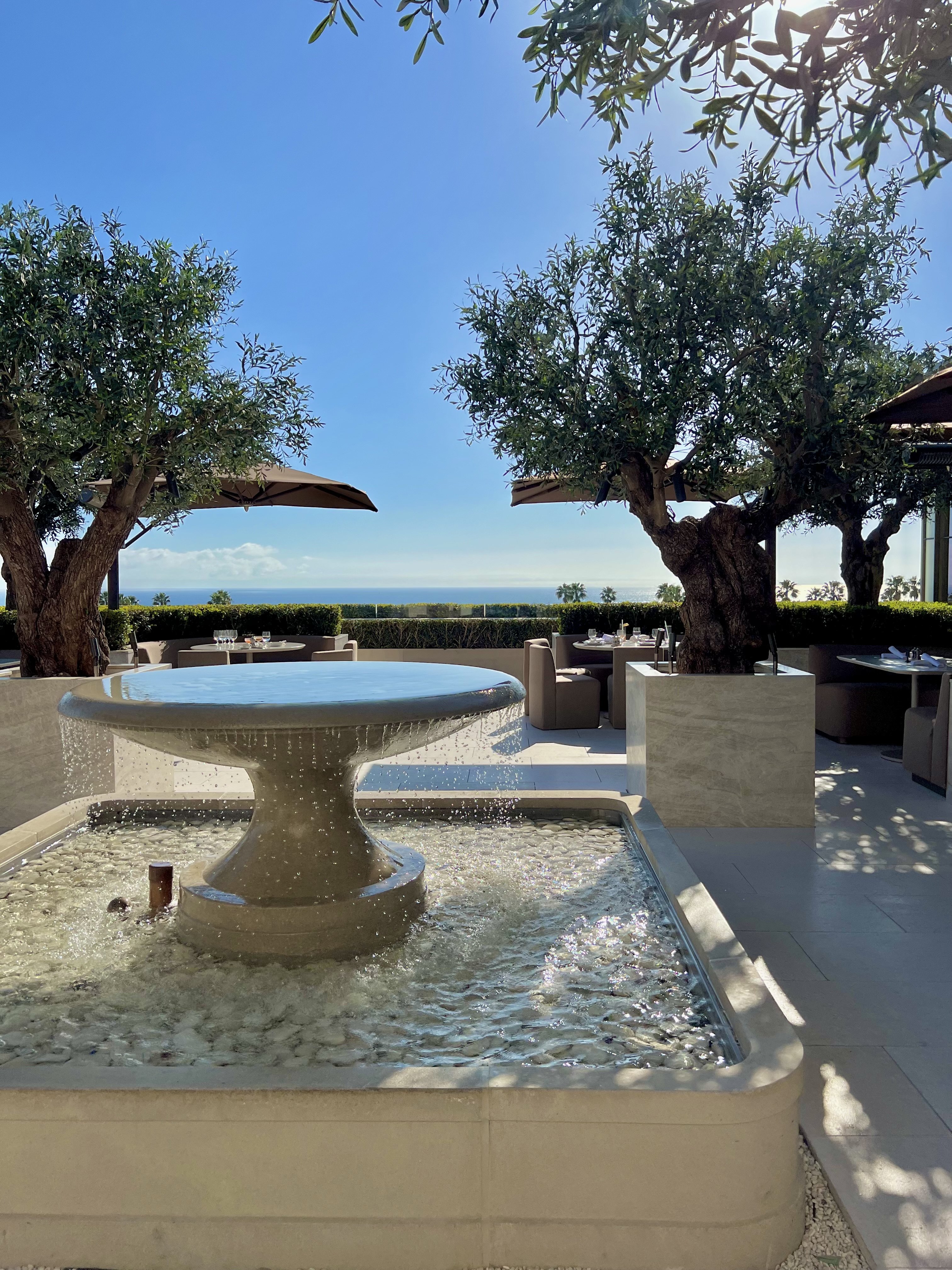 Dining at RH Ocean Grill on the rooftop of Restoration Hardware with ocean views, a beautiful atmosphere, and a fountain as the centerpiece.
