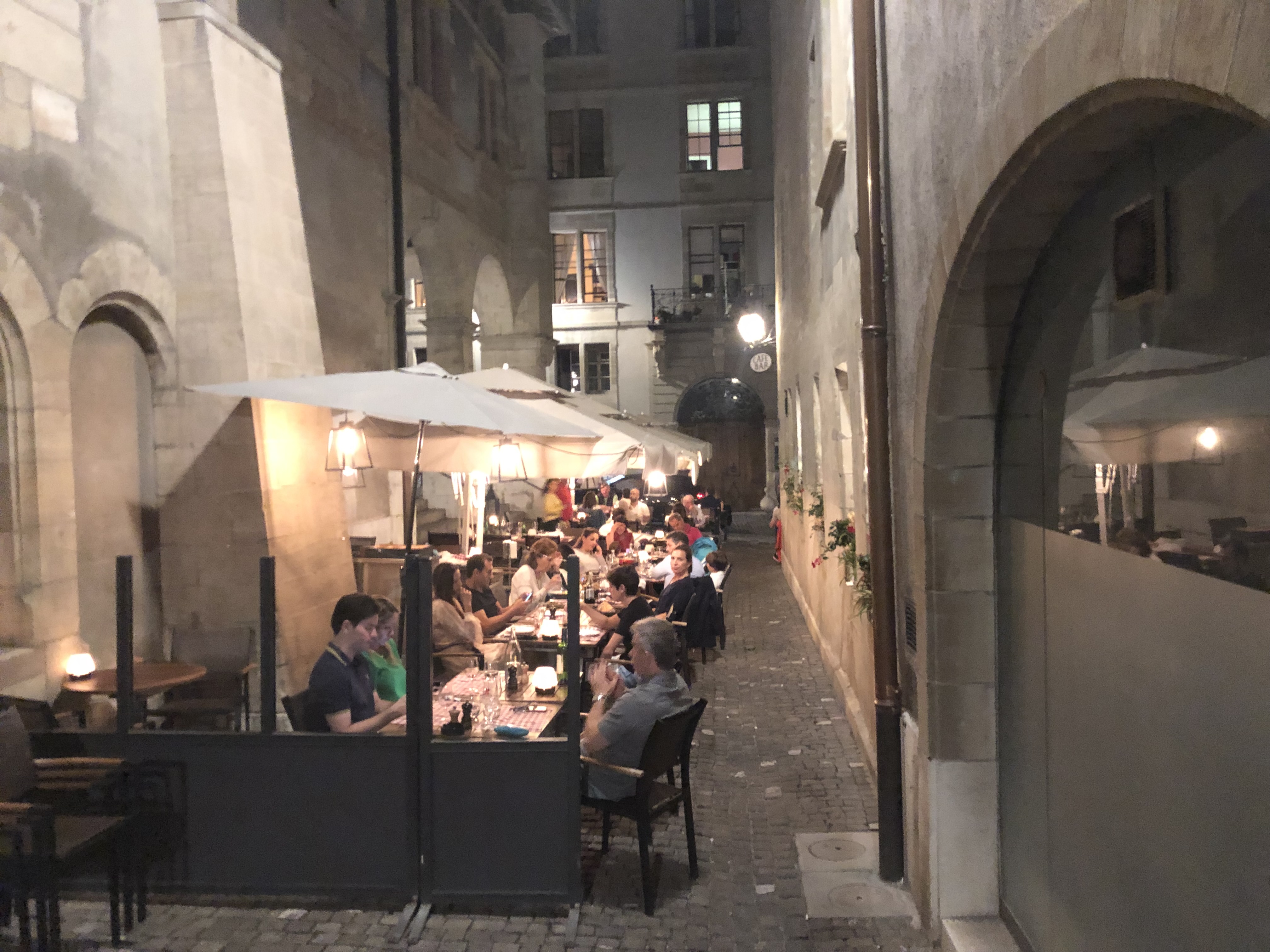 Outdoor dining along Geneva’s cobblestone streets
