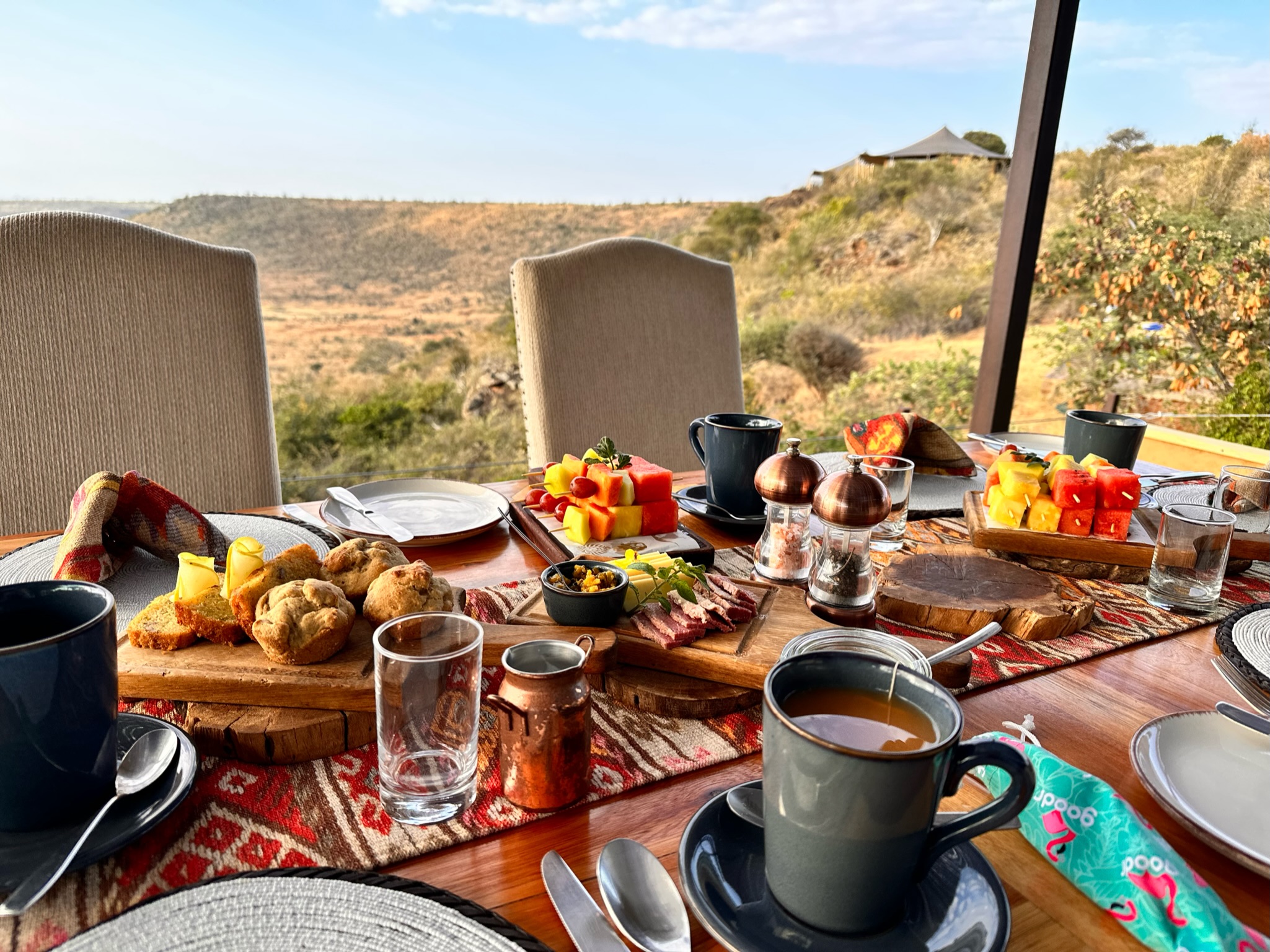 Food on safari is included in each of the lodges. From a large, leisurely lunch upon return from the morning game drive, to sundowner cocktails and snacks in the bush to concluding the day with a gourmet feast sourced from the on-site gardens, we were spoiled by the variety of options and flavors we experienced at each location. Whether dining above the Sand River as the Great Migration passed below, toasting in the bush at sunset, or dining by candlelight in a cozy lodge or tent, the incredible meals were only second to the tales we had to tell of our days spent on safari.