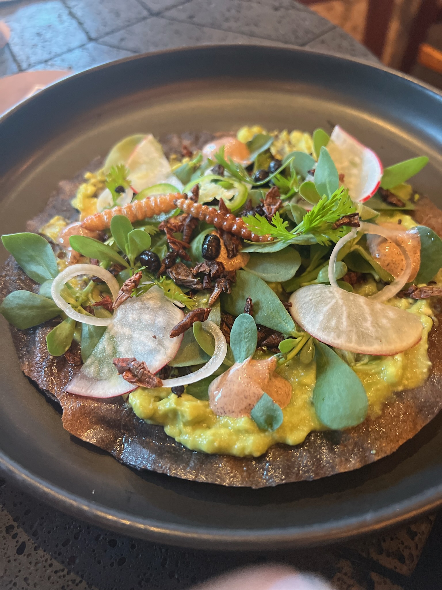 This is the insect toast with handmade tlayuda bread and seasonal insects.