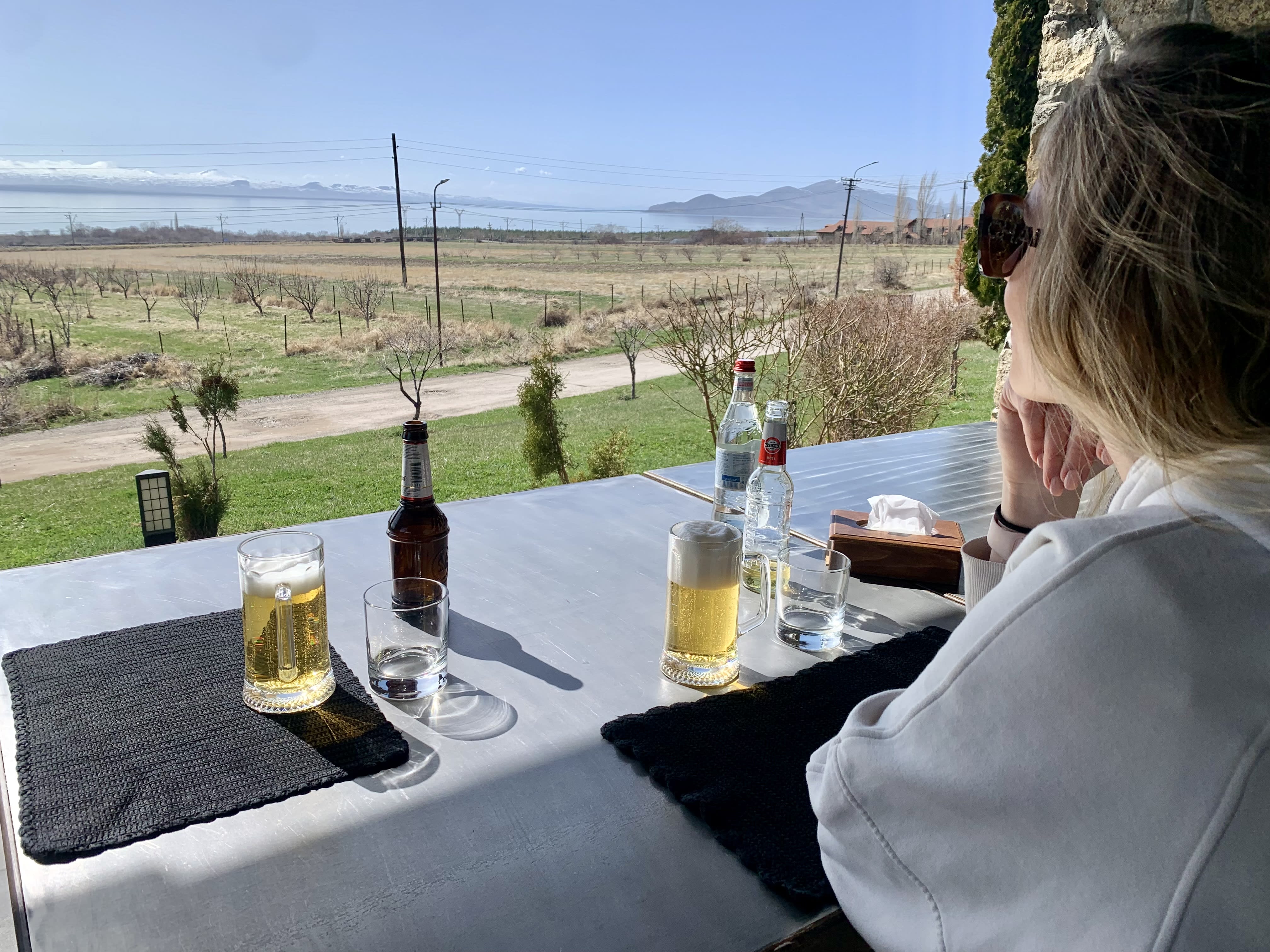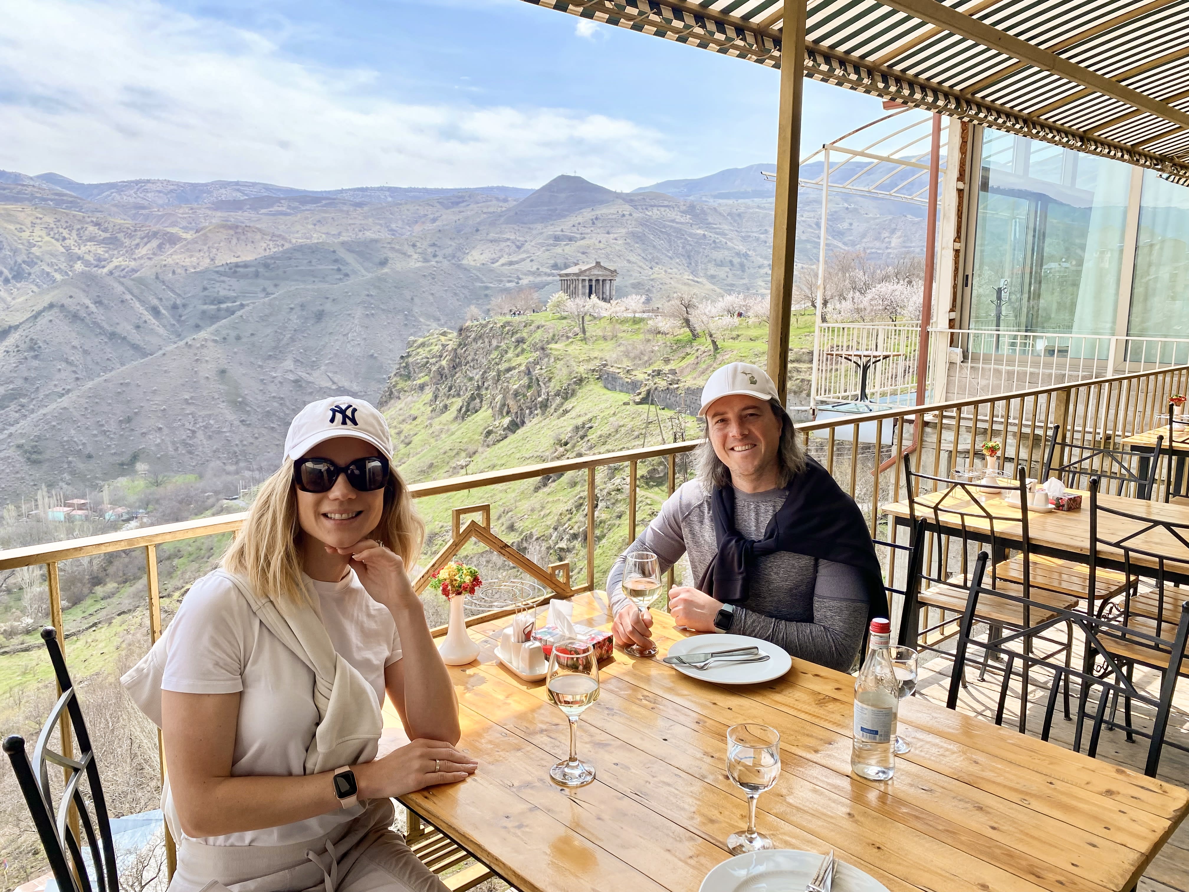 When your lunch spot comes with a side of history: Garni Temple in the distance, mountains all around, and Armenian wine on the table. Pure magic.