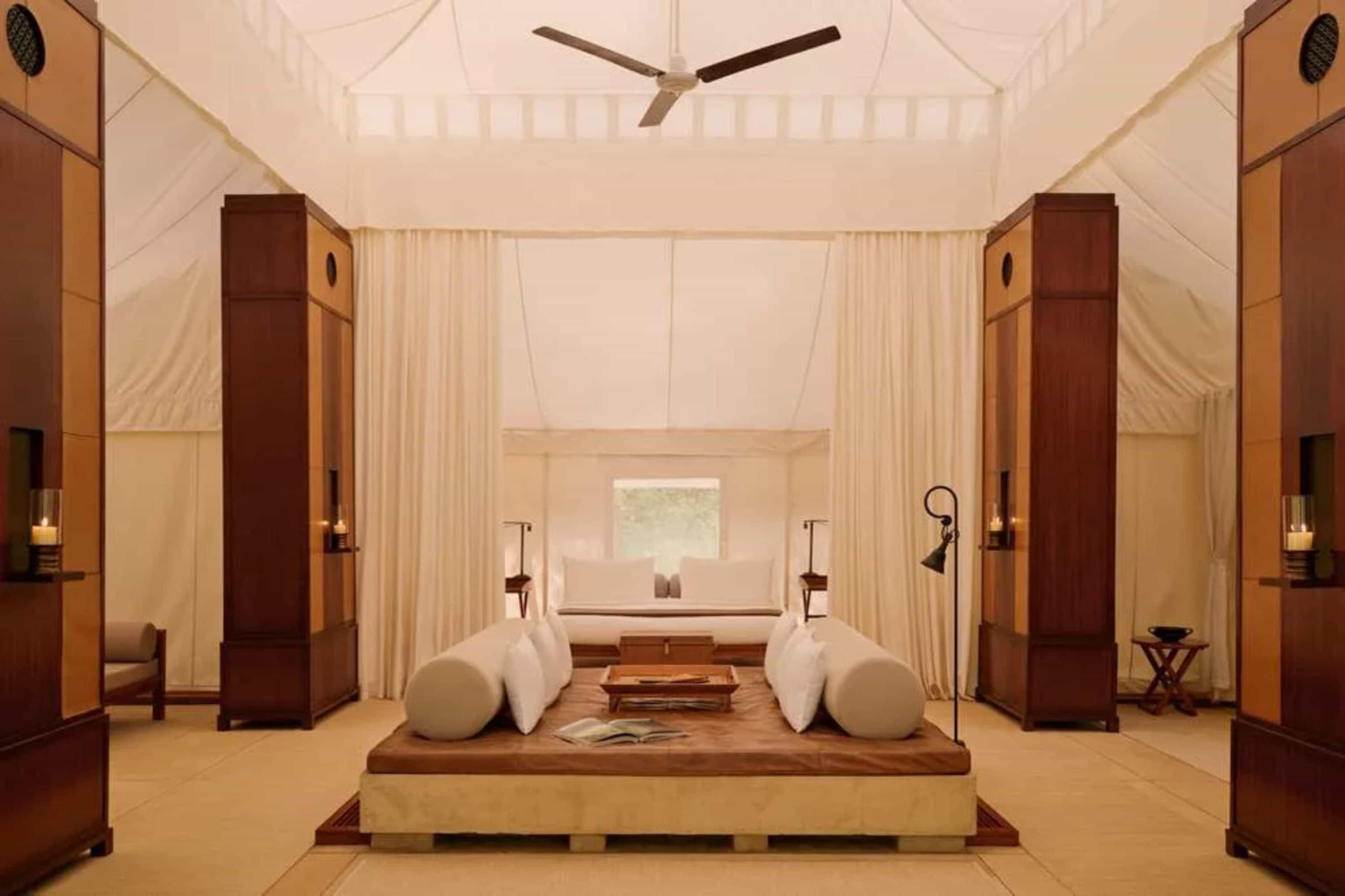 Each of the 11 air-conditioned tents are inspired by a 19th- and 20th-century safari aesthetic. They measure nearly 1,200 square feet and have separate sleeping, living and dining areas, plus bathrooms with freestanding soaking tubs and showers. Canopied patios allow you to enjoy the forest setting. Tent furnishings are exquisite, and challenge the definition of what “camping” can be. All stays include meals and drinks, minus alcohol. Stays also include daily expert-led jeep safaris into the national park. When you’re not exploring, enjoy open-air spa treatments, cool off in private plunge pools and savor Indian cuisine in the dining tent or on the resort’s Machan platform, which honors old traditions where hunters would enjoy open-fire meals on elevated platforms to escape jungle predators.