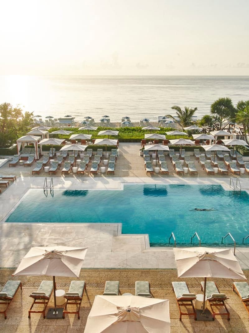 Four Seasons Palm Beach brings laid-back sophistication to the island’s widest stretch of sand. The look is timeless Florida chic—soft pistachio and rose tones, rattan accents, and a breezy mix of coastal art and texture. Days unfold at an easy pace: beach yoga at sunrise, spritzes by the adults-only pool, or ceviche-making classes with the chef. Florie’s, the Mediterranean-inspired restaurant by chef Mauro Colagreco, is a standout for elegant seaside dining. Families love the two-pool setup and kids’ program, while couples come for the oceanfront calm and flawless service (frozen fruit skewers appear the moment you think of them). Read more in our hotel spotlight.