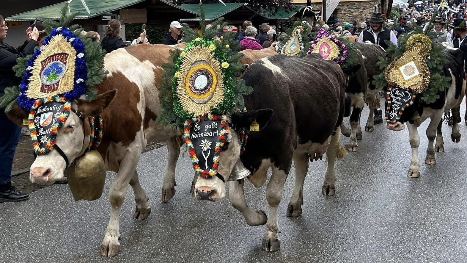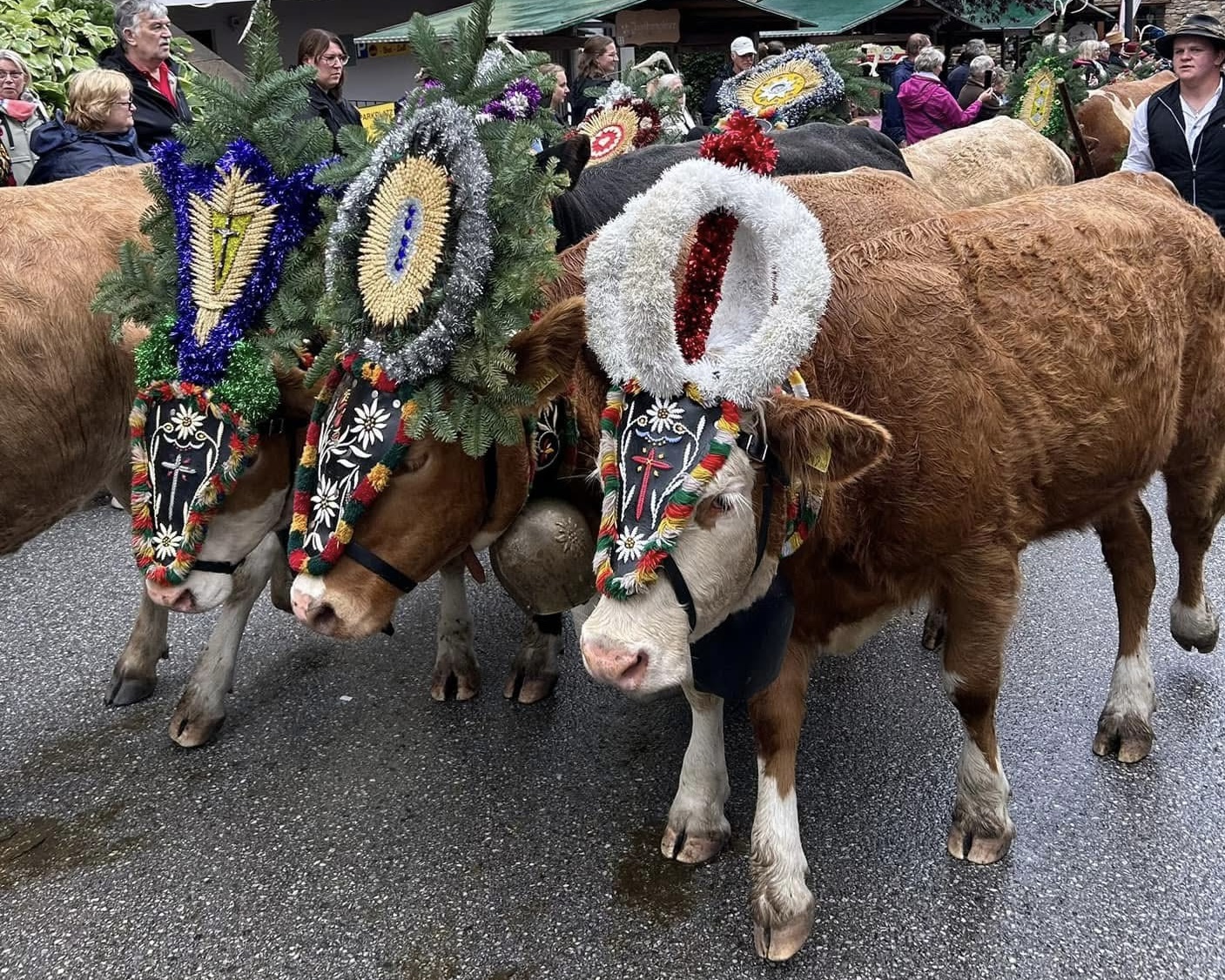 The cow parade is the biggest draw. The cows usually make their grand entrance down main street around noon. This is no regular cattle drive. The cows are dressed to impress, wearing elaborate headpieces made of fresh flowers, greenery, ribbons, leatherwork, and enormous bells that echo through the streets as they walk. Each farm has its own unique flair, so no two cows look the same. The farmers, along with their children, proudly guide their herds down the main street. There are no barriers and no fences—just you, the locals, and the cows, all up close and personal.