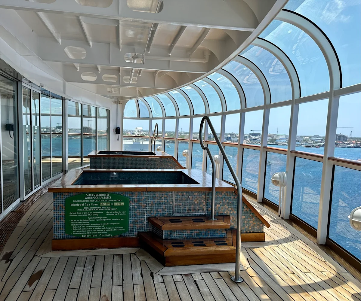 Next, I recommend purchasing a pass to the Senses Spas’ Rainforest Room. The Rainforest Room is a quiet area on the right-hand side of the Senses Spa and fitness area, and requires a special wristband to access it for those who prioritize exclusivity and relaxation. There are heated loungers, a private sun deck with hot tubs, hammam, sauna, rain showers, and practically a guarantee that it will be empty and never a wait. This experience is unlisted on the website, and can be booked once your reservation window opens.