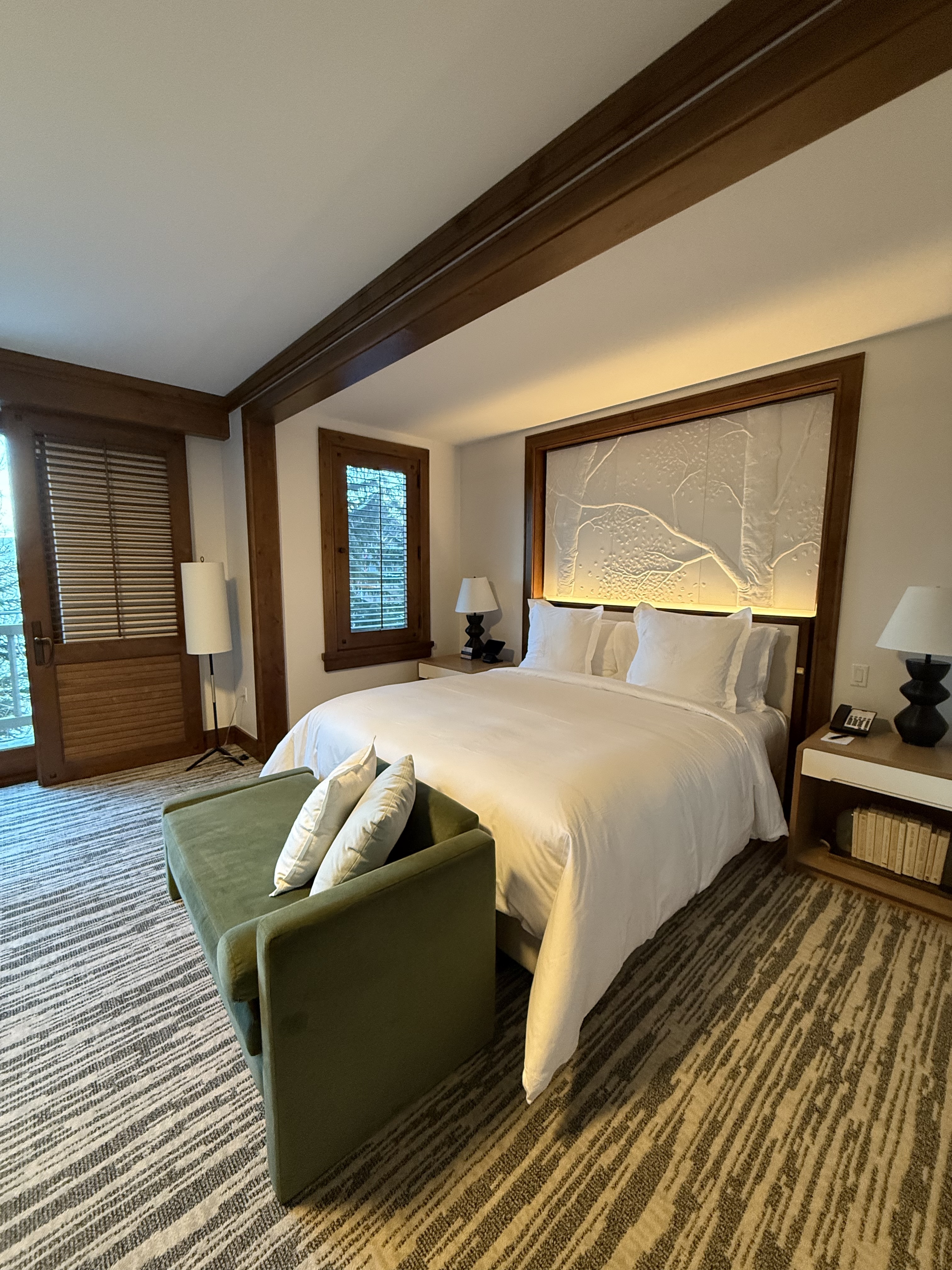 We stayed in a Valley View Room, the second room category up, and it beautifully reflected the design spirit of Wyoming. From the tree-like carpet to the mix of stone and wood throughout the room, every detail felt intentional. Brown, tan, and emerald accents combined with a backlit headboard and fireplace created a warm alpine feel.