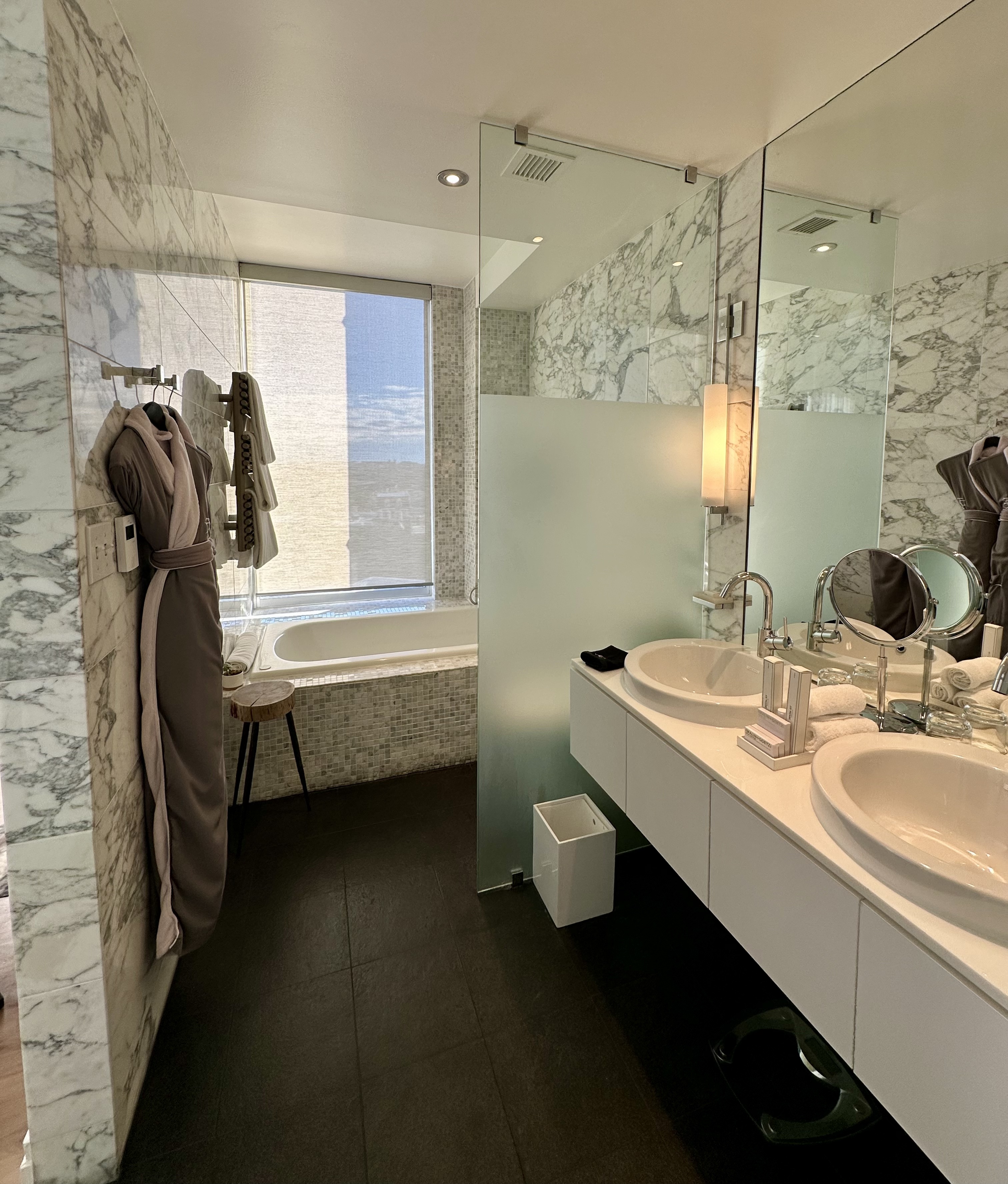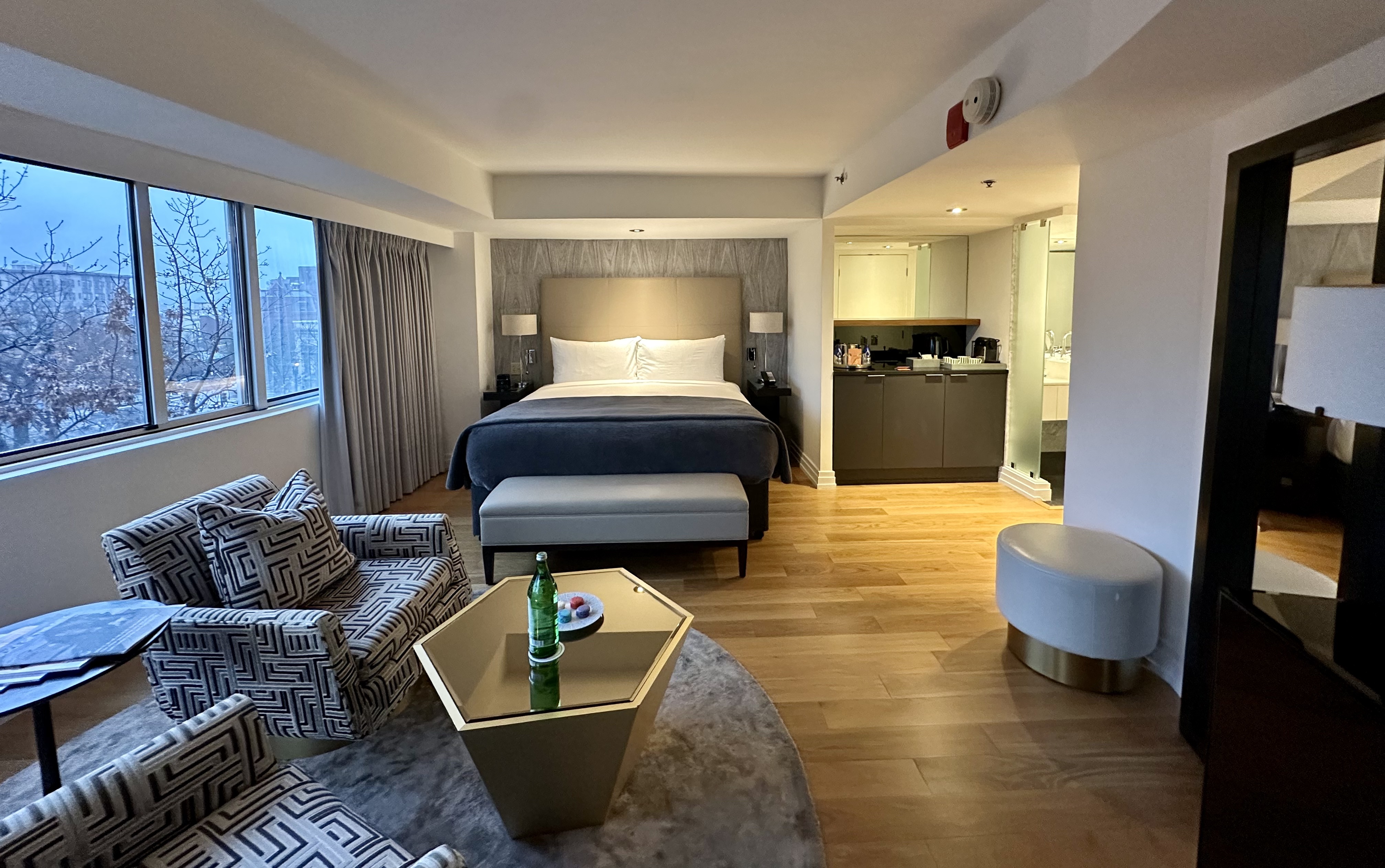 I stayed in a One-King Junior Suite, room 518, which can connect to the neighboring room via connecting doors that create a private hallway—an excellent setup for families or friends traveling together. Bathrooms are generously sized with heated floors throughout. While there are no sofa beds, rooms feature updated furniture and bedding, along with tea and coffee service, a Nespresso machine, and a minibar (complimentary along with local treats for suite guests).