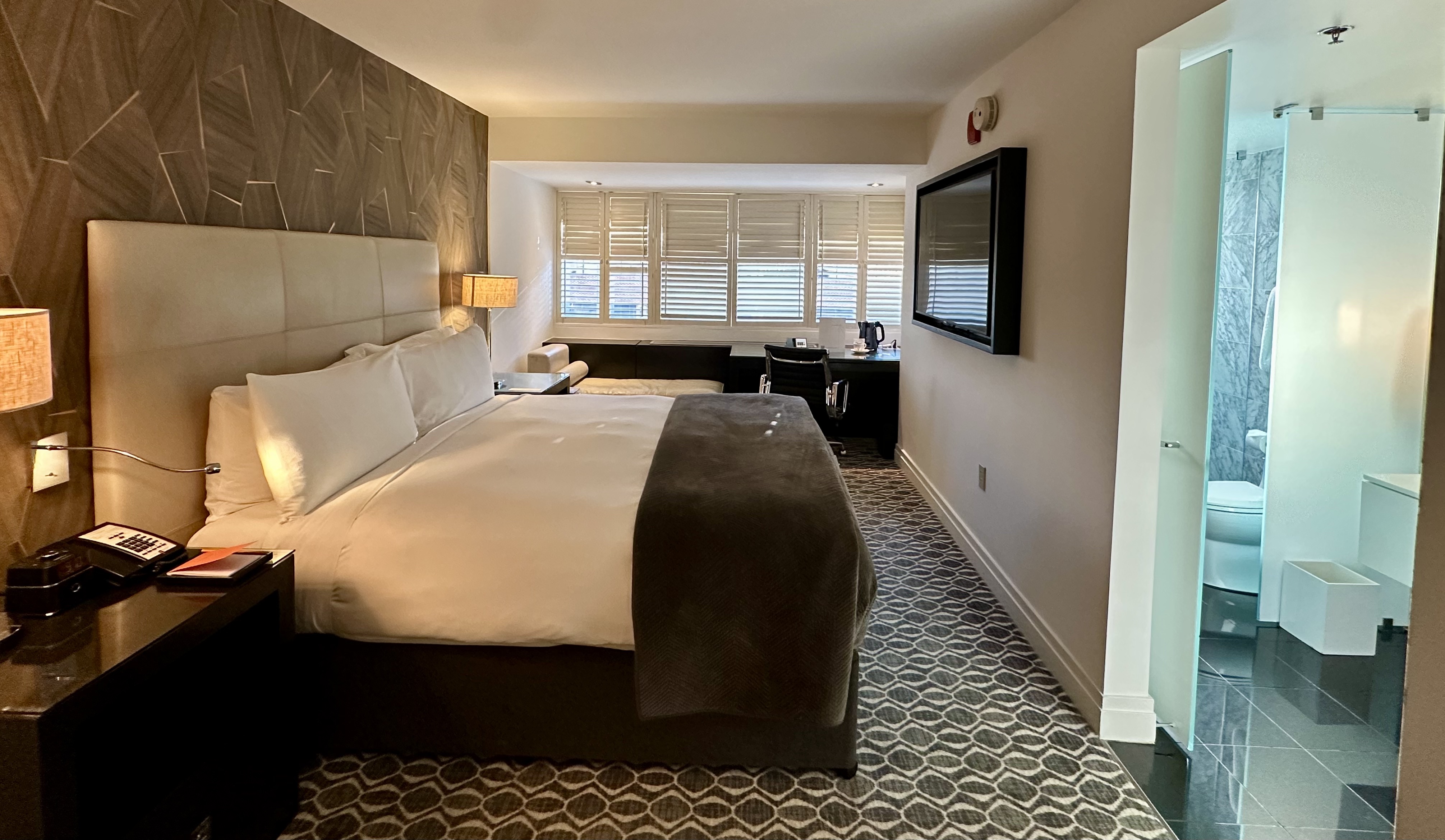 Every room features updated spa-inspired bathrooms with heated floors for comfort and luxury, regardless of category. Deluxe rooms face outward, and offer bright, sweeping views of the city—but because the hotel sits right on the circle, those rooms can pick up street noise if you’re sensitive. If quiet is a priority, book a Classic room that faces the interior courtyard and tends to be noticeably calmer. And if you need space to work, take calls, or spread out during your stay, the Executive King is a smart choice with extra room and a larger work area that supports productivity and comfort.