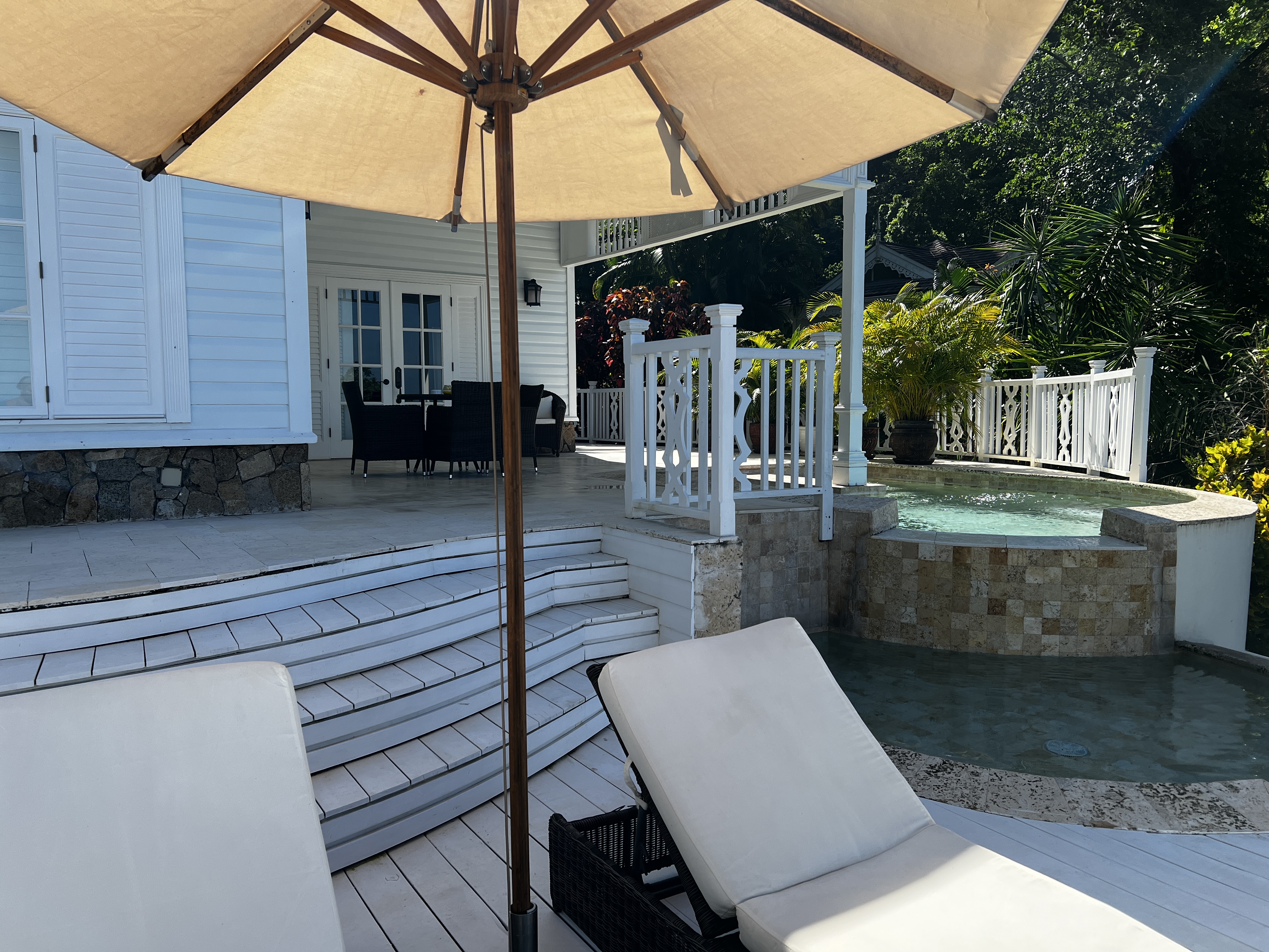Stepping outside through the patio doors, we found a table and beach chairs, along with not just one, but two pools: an infinity pool and a smaller one. Our villa came with a butler, available to assist us with anything we needed, whether it was rides to different areas of the resort, soap, or more champagne.