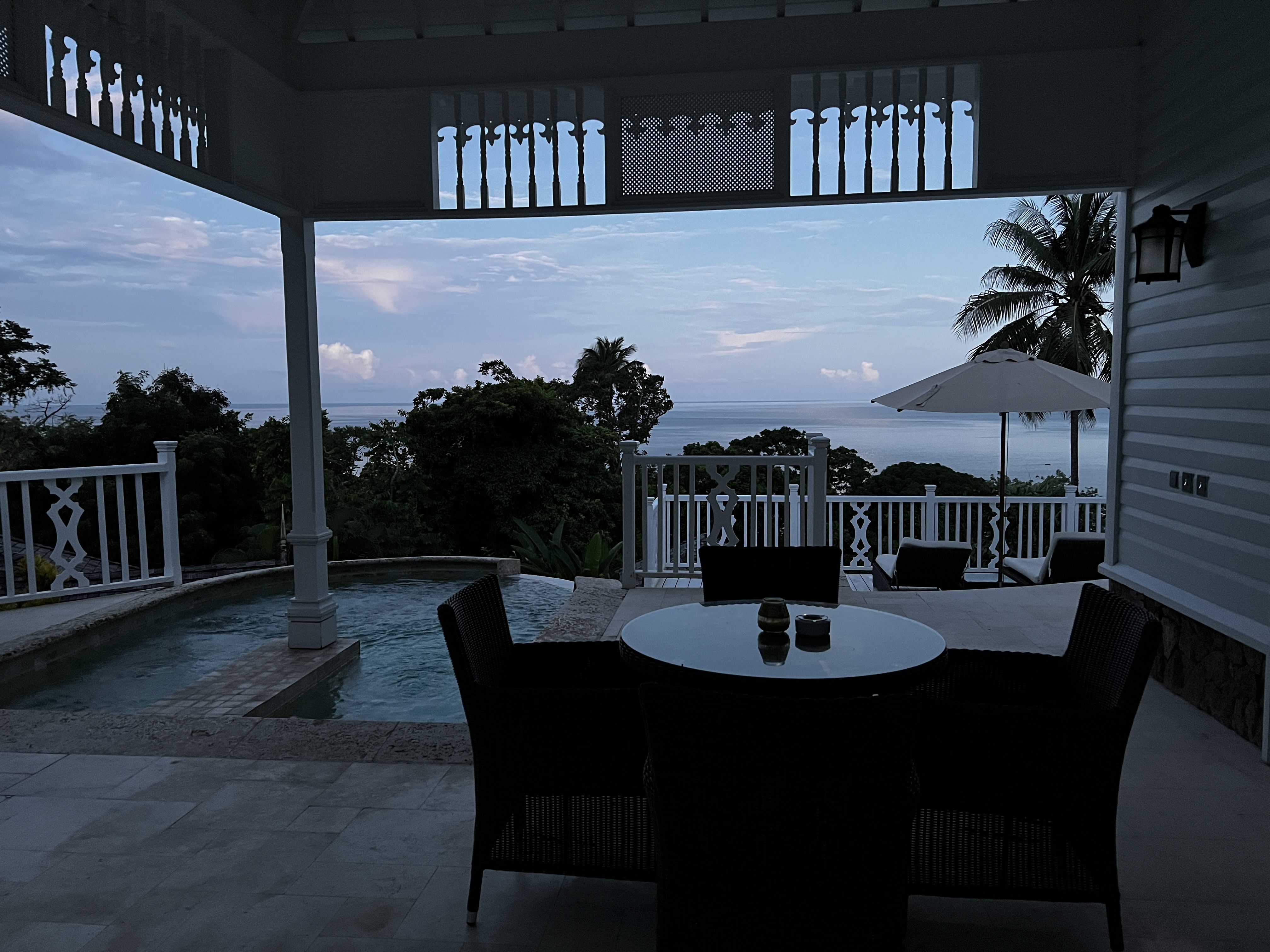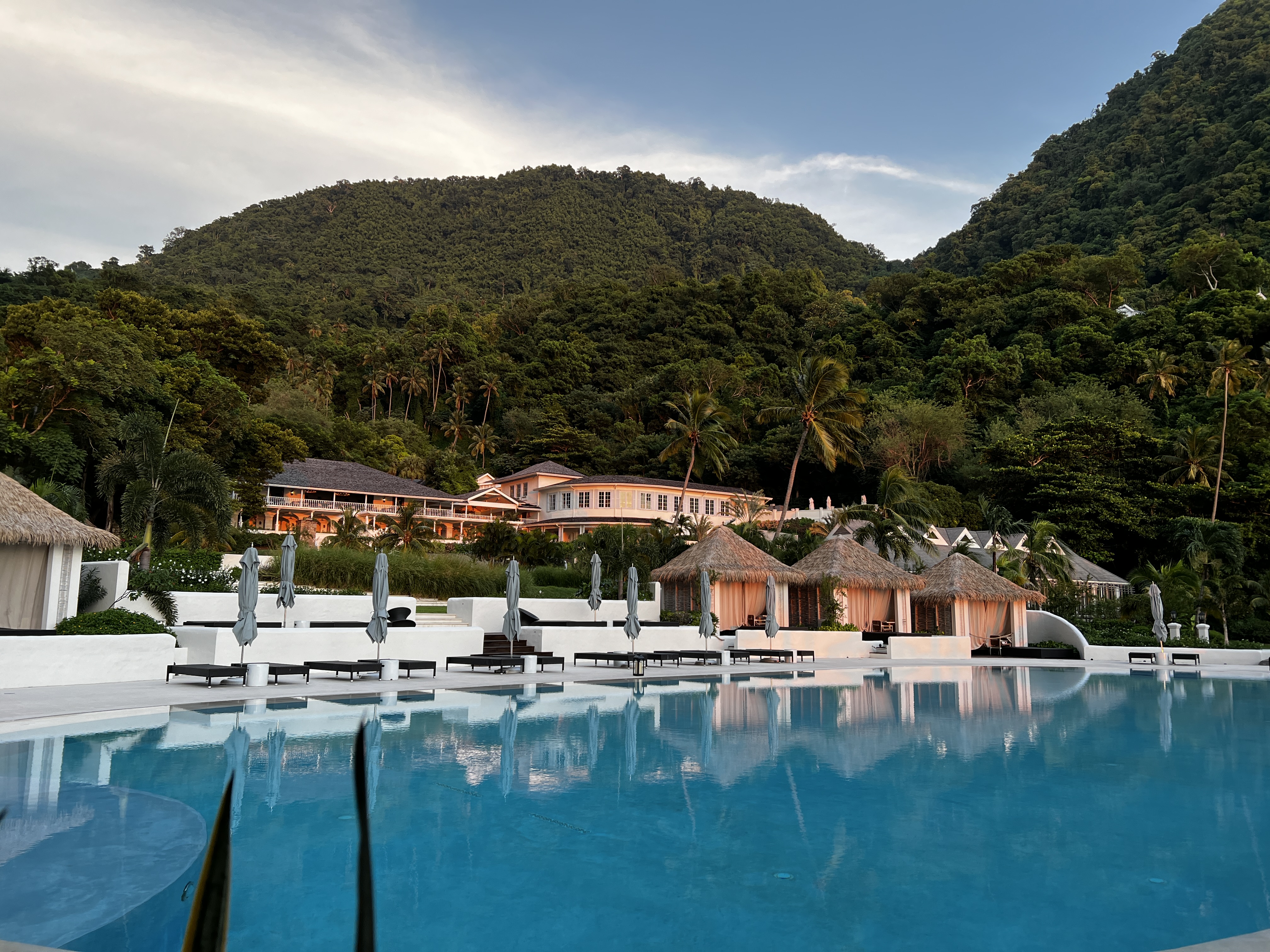 The rooms feature a “clean” aesthetic, showcasing dark floors paired with crisp white linens and a breathtaking view of the Pitons. We enjoyed a spacious closet—larger than my own at home—a soaking tub, and a separate shower. The living area was complete with comfortable couches and a television, as well as a half bath.
