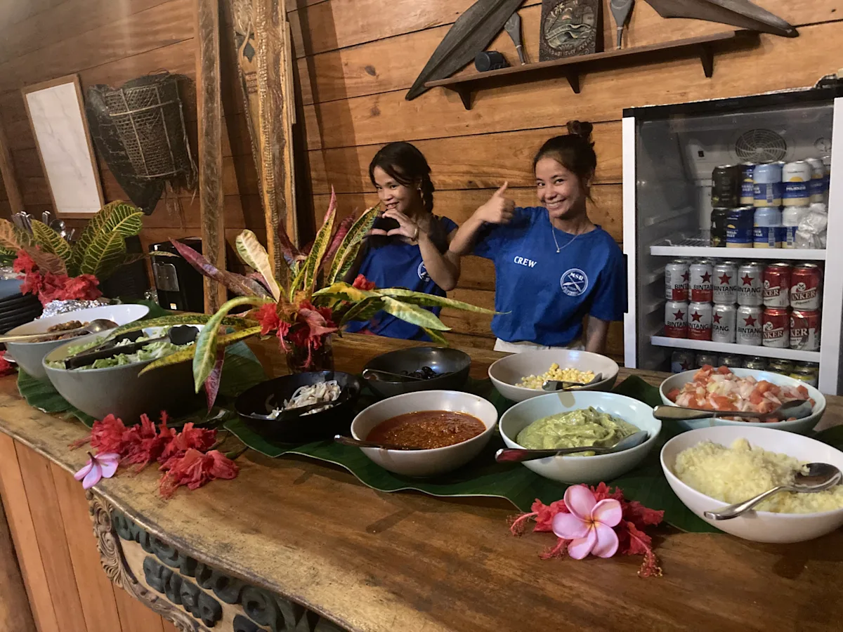 All meals, snacks and beverages are included in the retreat (alcoholic beverages and sodas are an extra charge), as there are no other facilities available. The meals are a blend of western and local Indonesian cuisine, made with fresh and often locally sourced ingredients. The meals are one of the best parts of the trip. They are both delicious, plentiful, and served with a presentation that shows how much the kitchen staff cares about their work. On the daily surfing boat trips, the crew packs a cooler with snacks and cold beverages so you will never go hungry or thirsty!