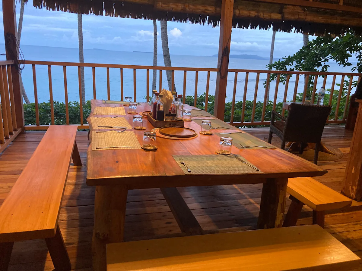 In addition to the bungalows, there is a larger two-story bungalow that serves as the common area, bar and dining room. As with the bungalows, the views from here are amazing — you can (and I did) spend hours relaxing and watching the waves. The property itself is situated along a rocky shoreline with a small sandy beach, and is nestled among palm trees that fill the island.