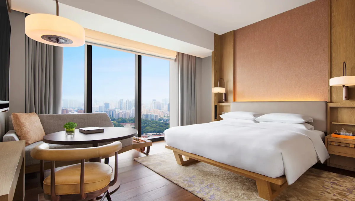 The Andaz Singapore features 342 rooms, including 26 luxurious suites. The standard 409-square-foot Deluxe King rooms are designed with understated earthy hues that create a calming atmosphere. Each room boasts floor-to-ceiling soundproofed glass windows, providing stunning skyline vistas while ensuring a peaceful retreat from the city's hustle and bustle. Thoughtful amenities like a complimentary daily restocked minibar, a Nespresso machine and high-end Christophe Laudamiel bath products further enhance the experience, making each stay both comfortable and indulgent.