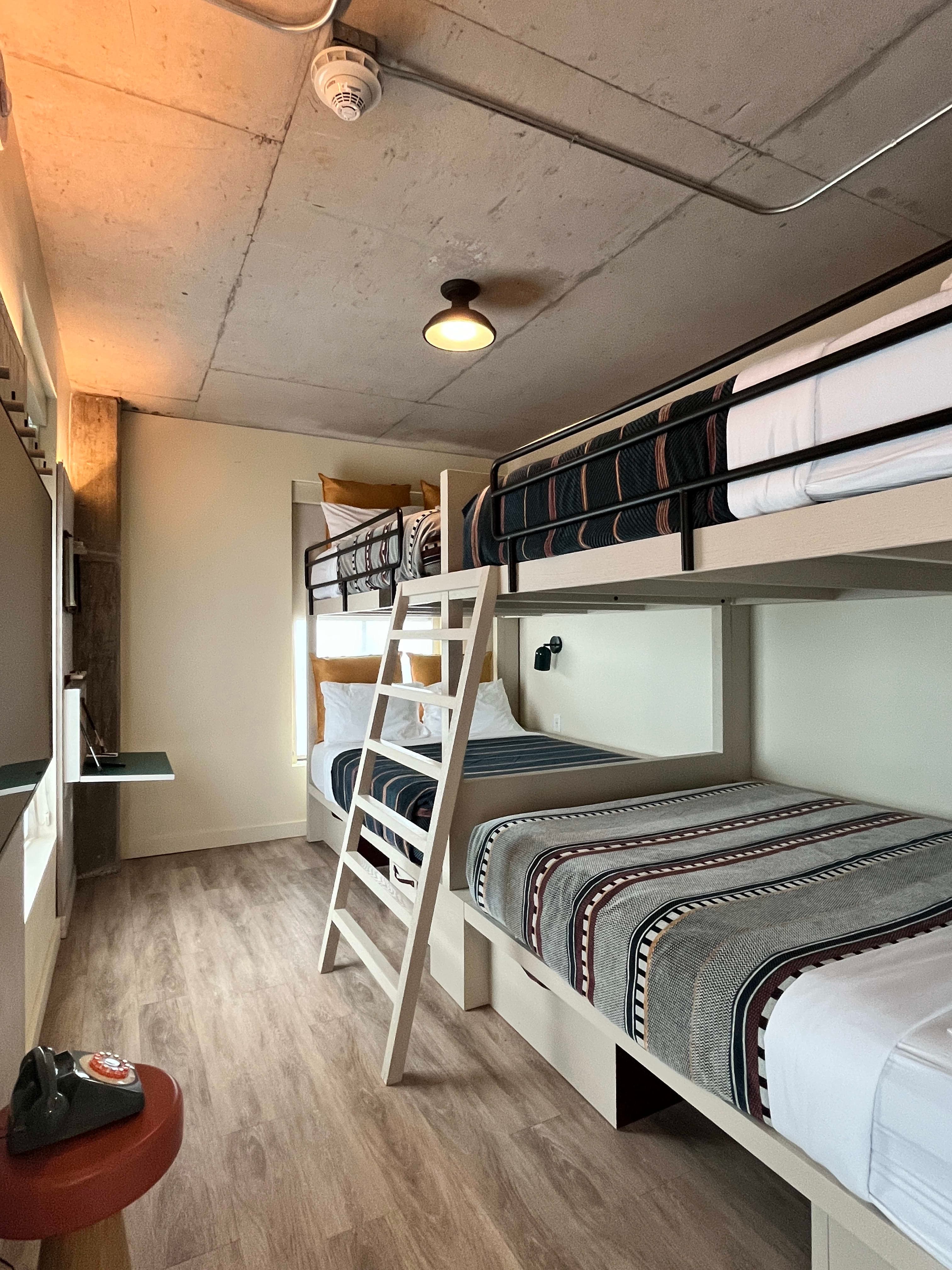 The best part of this hotel is how it can be so easily curated for groups. They offer quad-queen bunk rooms, which can sleep up to 8 people. Double-queen rooms, which can sleep up to 4 and corner king rooms. Each room has ample storage with pegs on the walls to use for hanging things and a fold-up desk with a seat that doubles as a suitcase holder. Each bedroom has their own steamer.