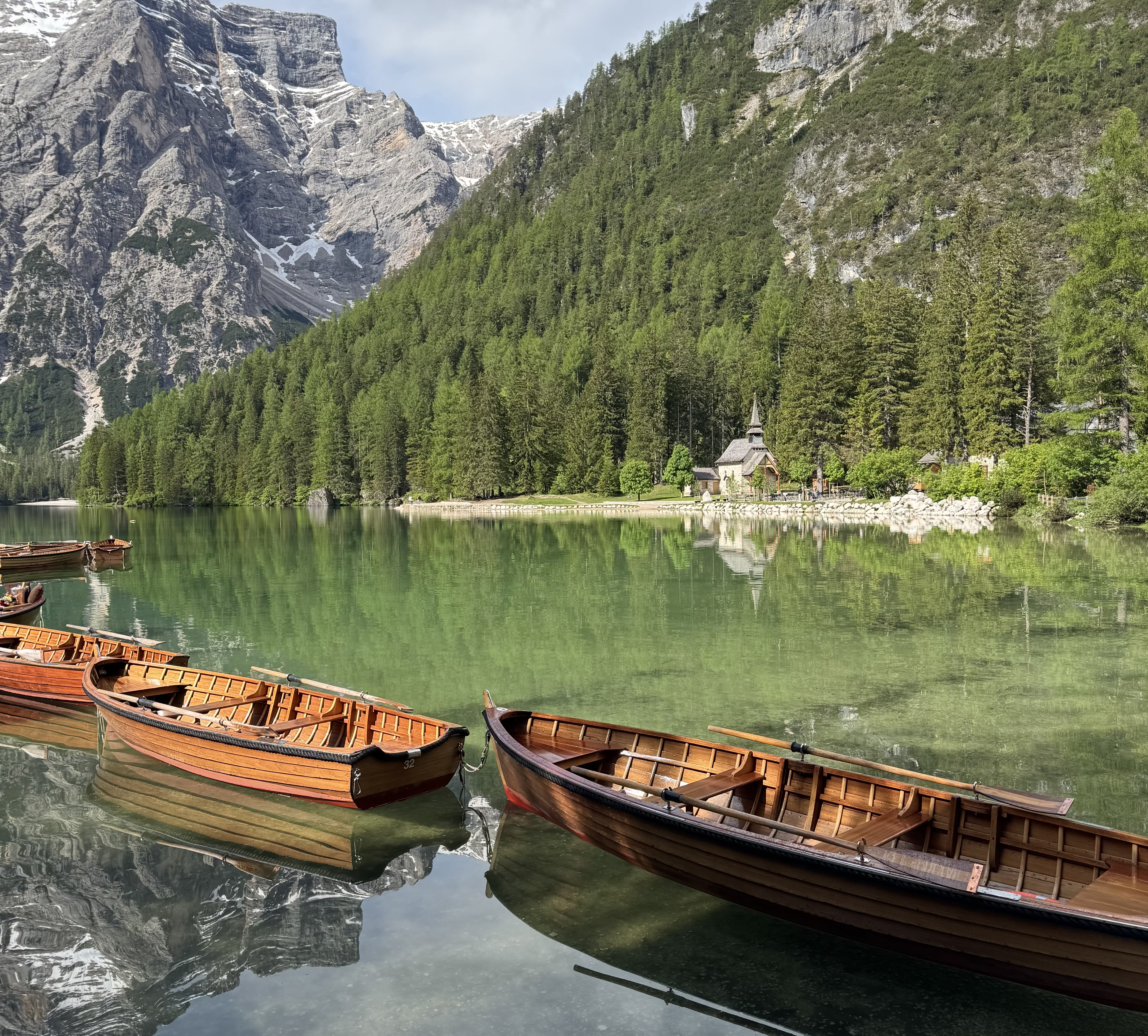 Called the “Pearl of the Dolomites,” you’ve likely already seen the picture-perfect aquamarine mountain lake Lago di Braies/Pragser Wildsee in photographs. It’s a popular spot because the circumnavigating two-mile trail is “easy” by Dolomite standards and the views of the lake are constantly changing based on where you are and what time of day it is. To beat the crowds (and crowded is an understatement), arrive at sunrise or sunset. Even better, book a three-night minimum stay (including half-board) at the historic Hotel Pragser Wildsee, which sits right on the lakeshore. Hotel stays offer access to the lake when the day-trippers have left, along with a private patio and lakeside corner where you can monitor the line for the handmade rowboat rentals—another must-do activity. Make sure to take a detour of the lake loop and have a wuster or schnitzel plus beer at Malga Foresta/ Grünwaldalm zum Hartl. And if you can brave the cold water, take a dip in the lake from the rocky beach area near the church.