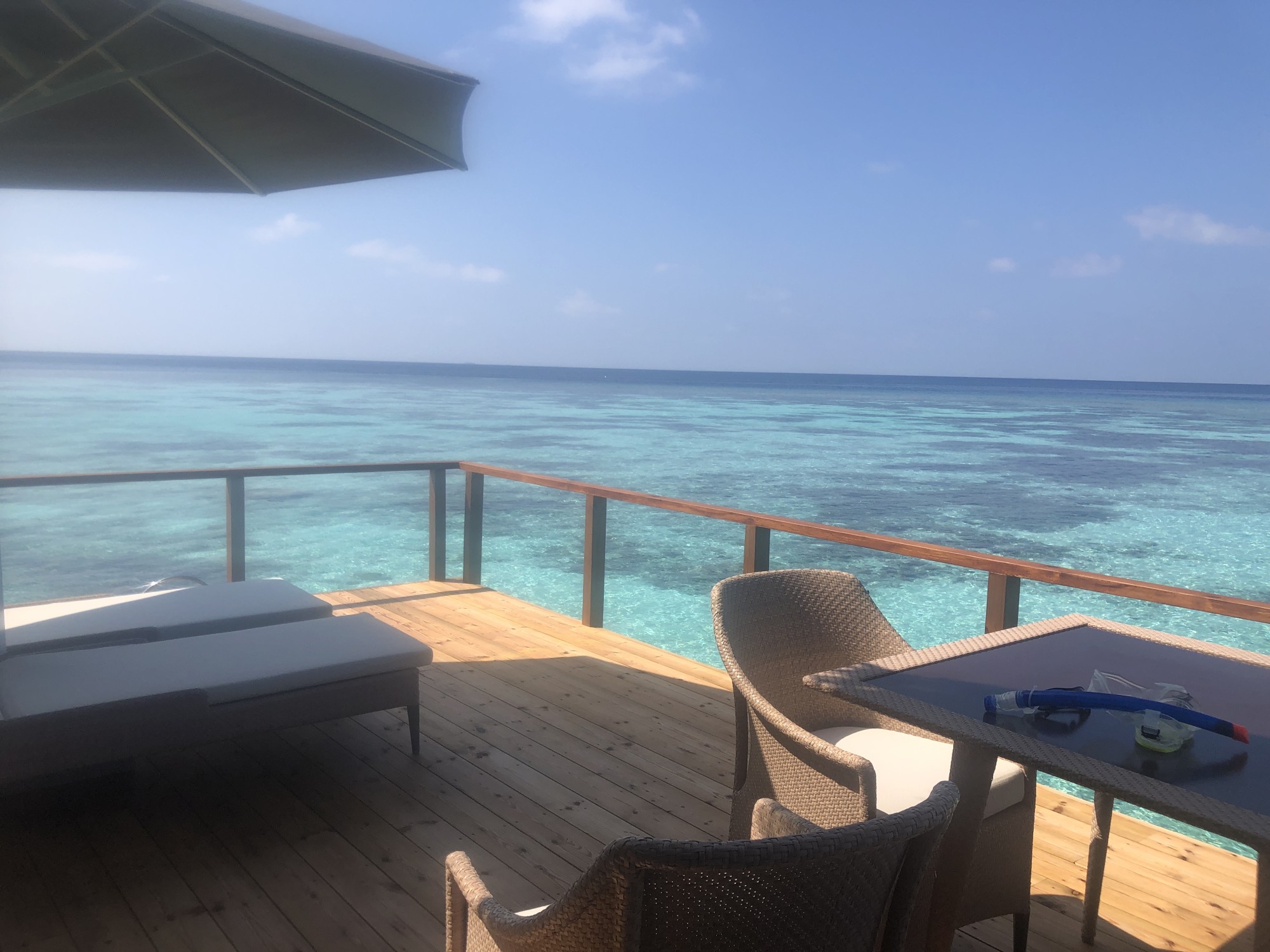 We spent the last four nights in Overwater Villa 201, which was smartly decorated and furnished. The views are stunning and panoramic since it is located on the end. Just exquisite! The deck is huge with several sitting areas to relax in.