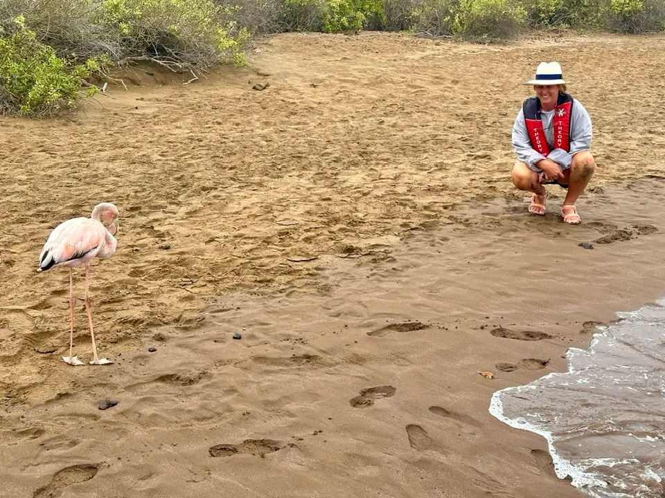 If this wasn’t enough animal adventure, earlier in the day, we watched whales surface in the distance, a turtle make a beach landing, and seals play with a puffer fish like it was a ball. Pink and black flamingos stood majestically on an island lagoon as they preened themselves. We observed in awe as two juvenile flamingos left the lagoon to prance along the beach among us while prehistoric-looking marine iguanas sat still like rocks. Blue-footed boobies and frigates squawked around us. Each island presents many delights. From albatross performing their mating rituals and launching themselves off cliff sides, to red-footed boobies nesting, blue footed boobies keeping an egg warm, and giant Galapagos land tortoises munching on guava fruit.