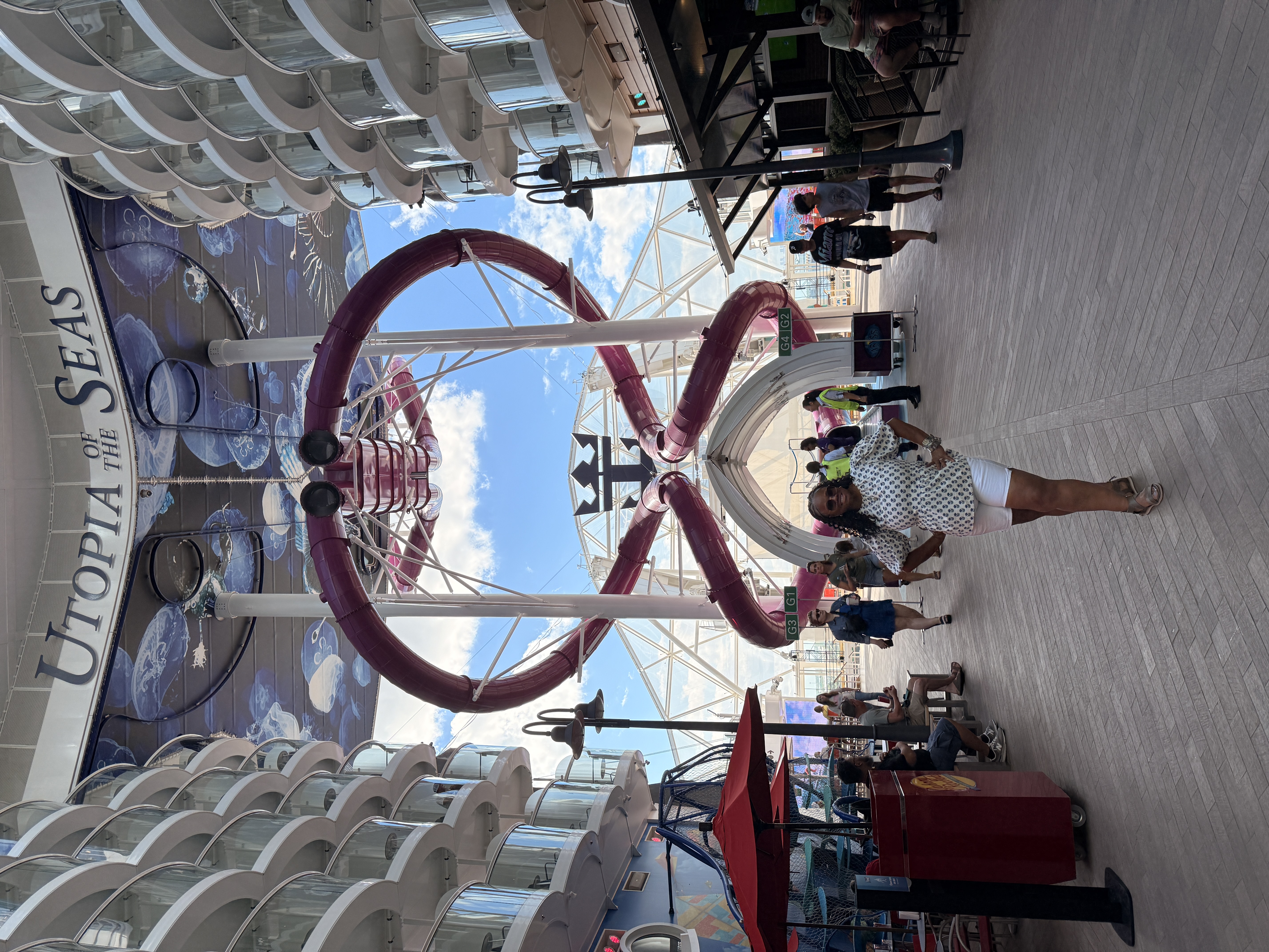 One of my favorite photo moments onboard, standing in front of the Utopia of the Seas lettering with The Ultimate Abyss slides towering in the background.