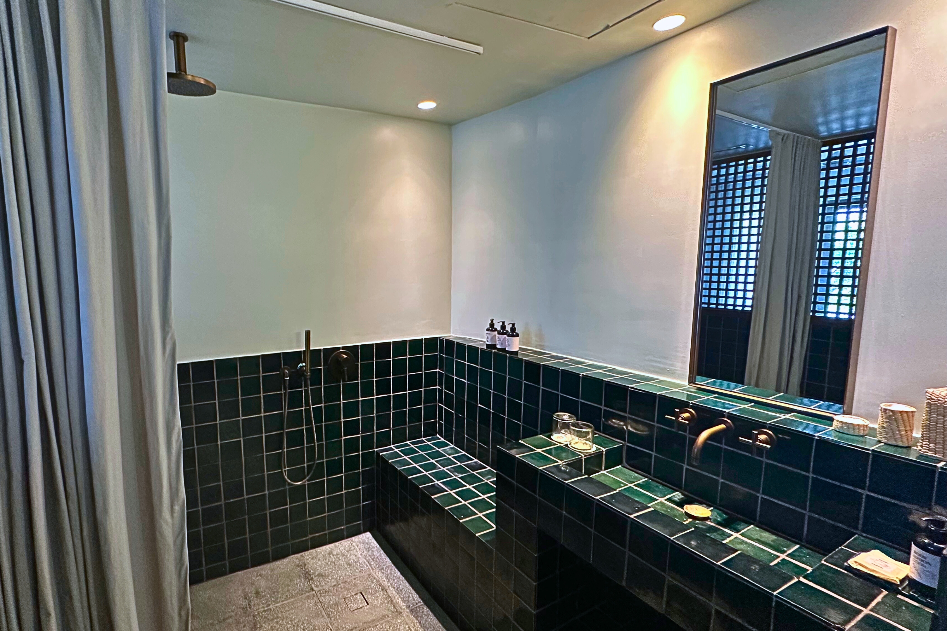 The bathrooms have gorgeous deep green tile and rainfall showers