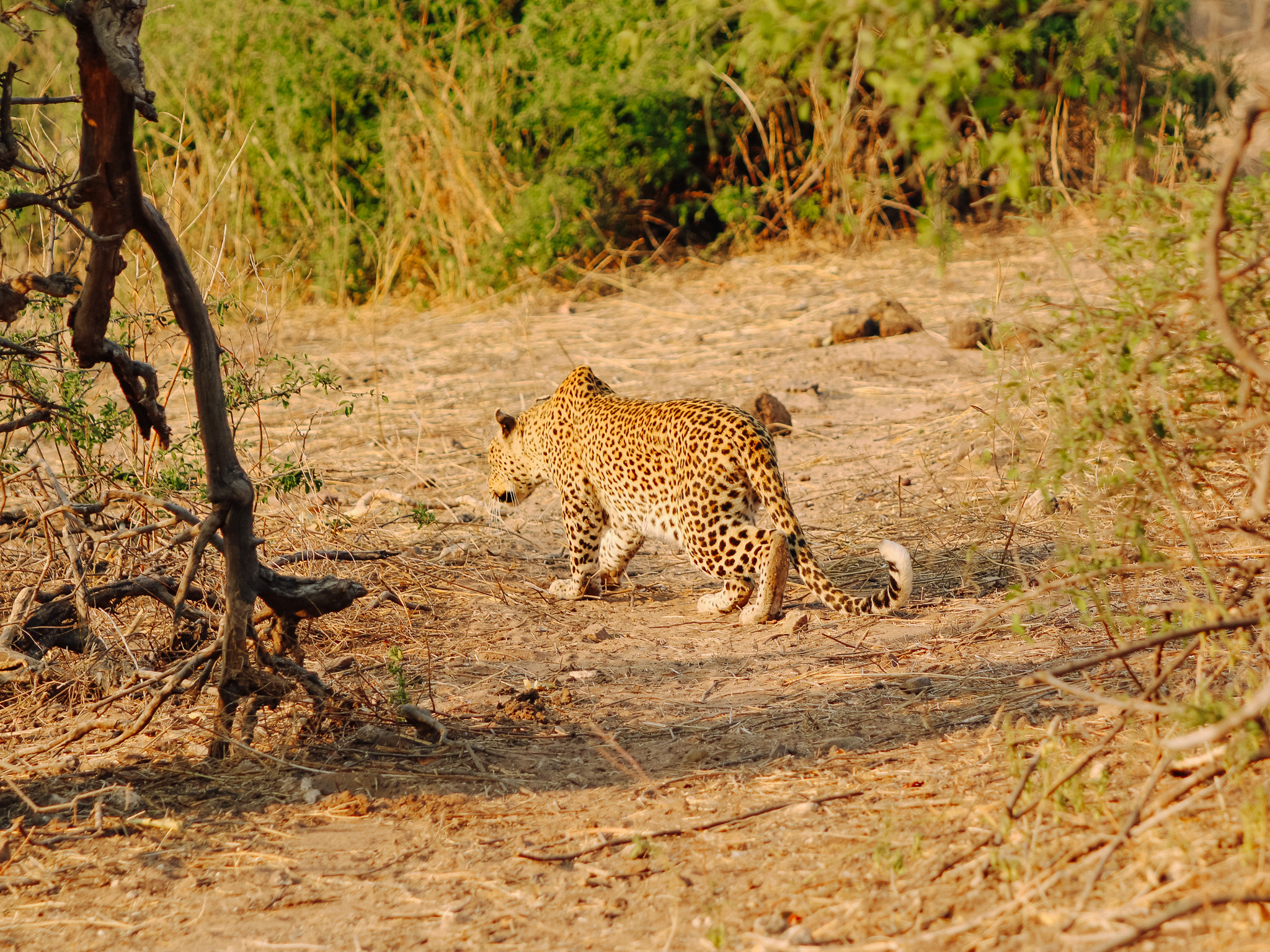 Because Chobe is a national park, off-roading isn't permitted, but this didn't limit our sightings. Our guide, Tony, used the presence of other vehicles to his advantage, stopping to chat with guides he knew who'd share tips on nearby activity. This led us to a female leopard mid-stalk—we watched her creeping toward prey, completely absorbed in the hunt.