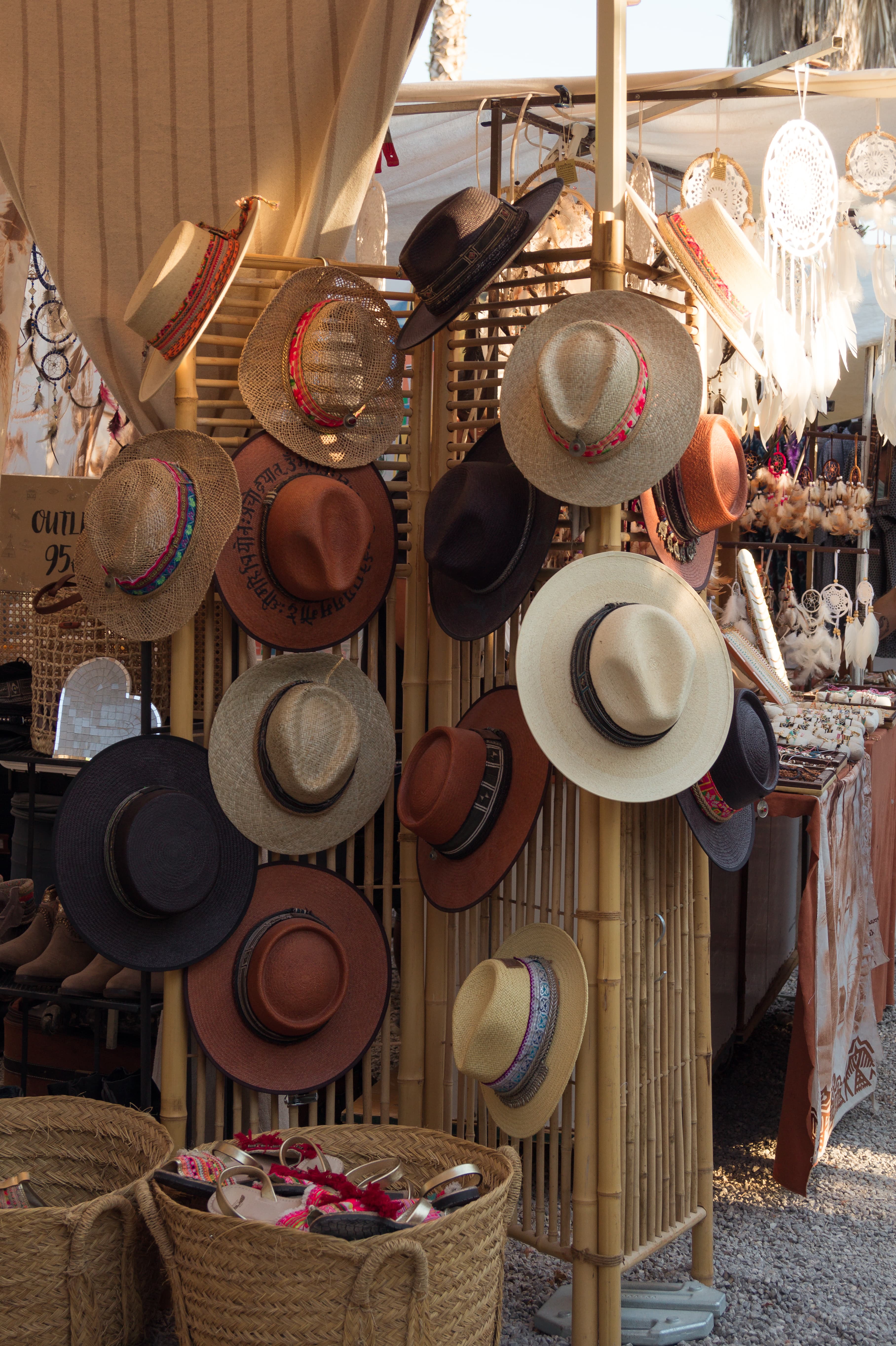 Handmade palm hats at Las Dalias bohemian market (Sant Carles, Ibiza, Spain). Credit: Alejandro Tapia