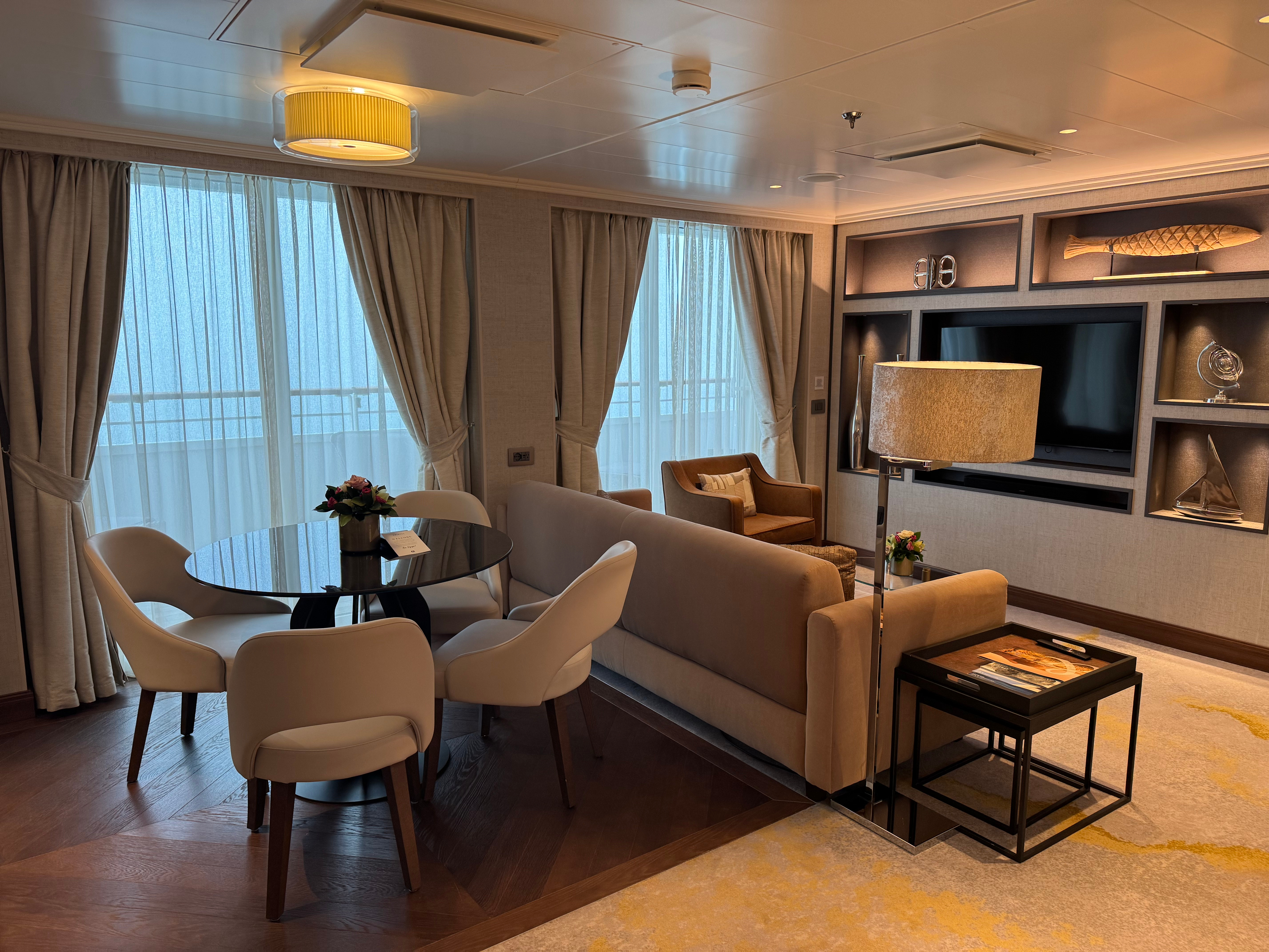From the moment guests step on board, every detail feels polished yet relaxed. Each suite includes thoughtful amenities such as a stocked refrigerator with wine, beer, soda, and water, sparkling wine on ice, a box of truffles, and personalized touches like two types of robes per person that make travelers feel immediately at home.