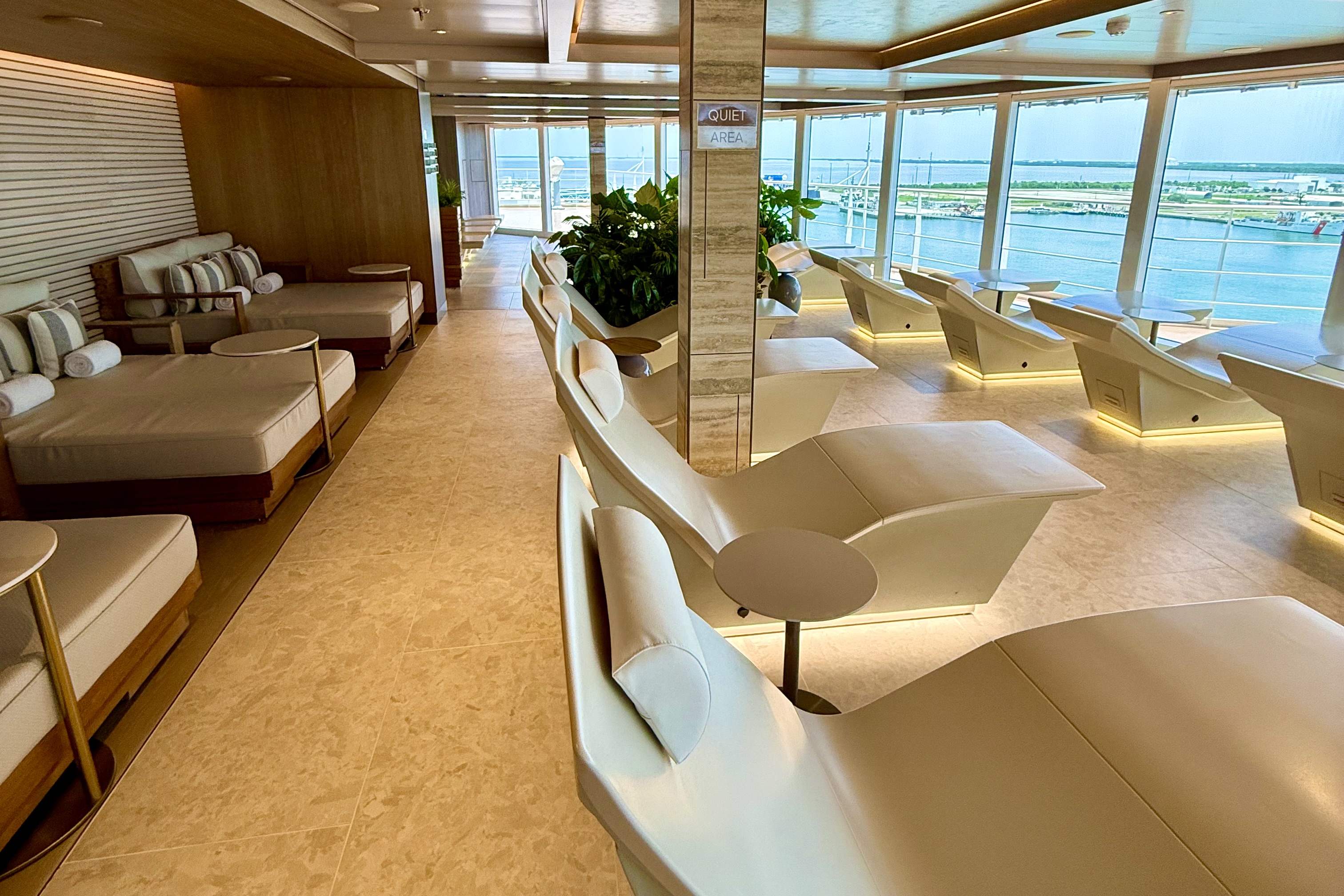 For those who prioritize peace and quiet, the ship offers plenty of secluded retreats, most notably the stunning thermal suite. This magnificent spa is truly the best we have ever seen on a cruise ship. It features a two-story waterfall, a vitality pool, a flotation salt pool, and a variety of saunas, including a charcoal and clay sauna, as well as a snow room. We especially enjoyed the two dozen heated tile loungers, which were perfect for relaxing and staring out to sea.