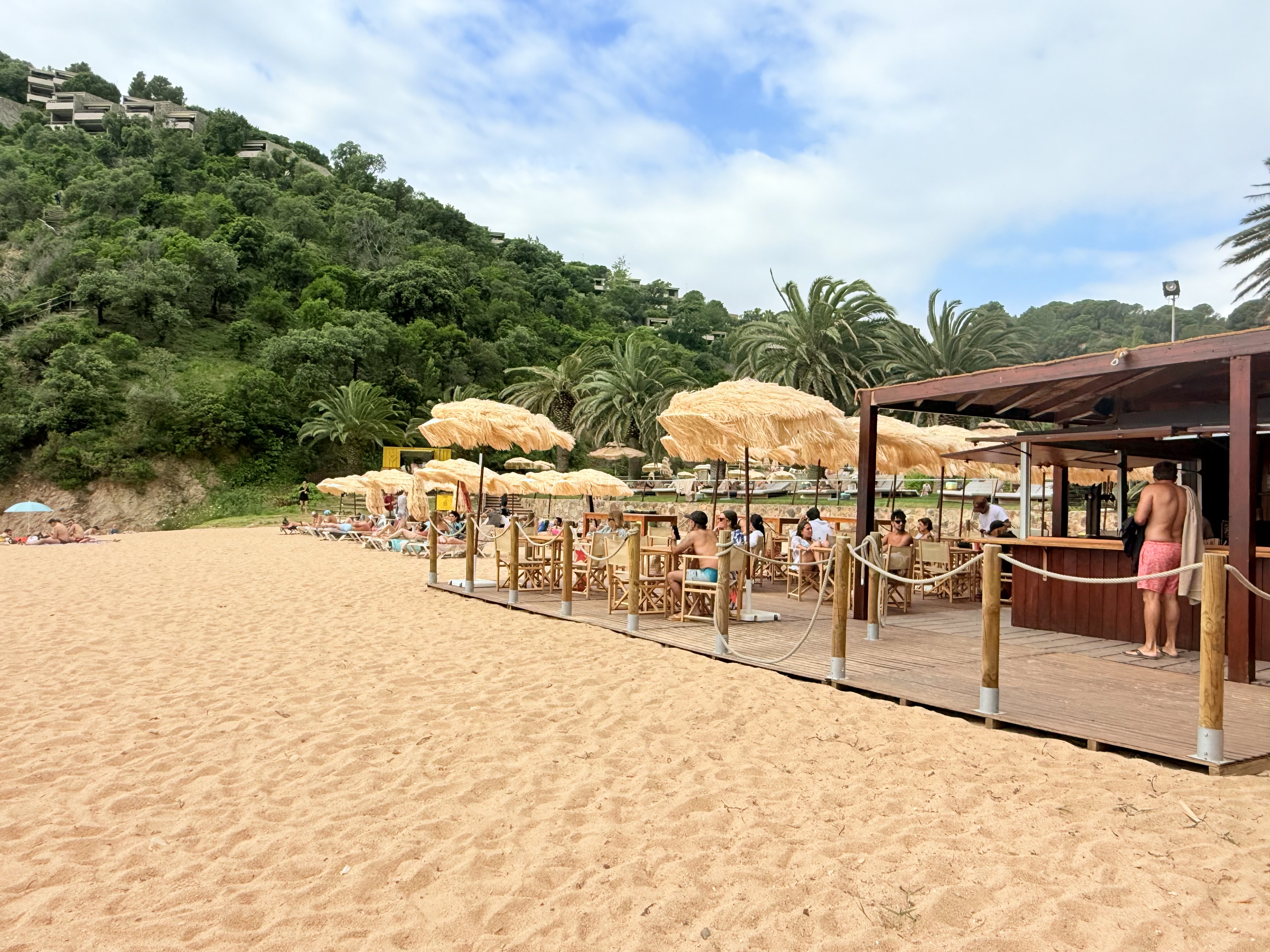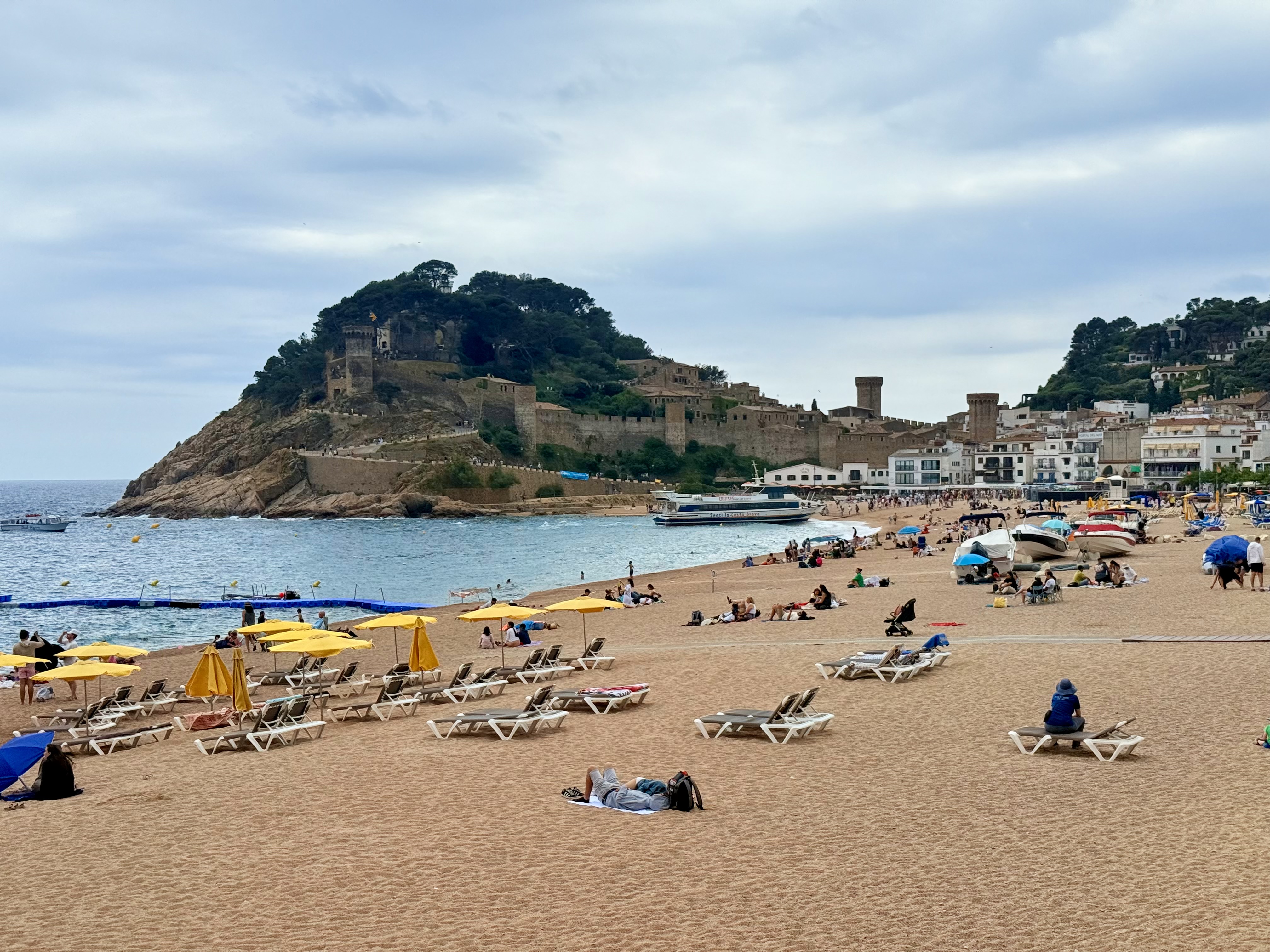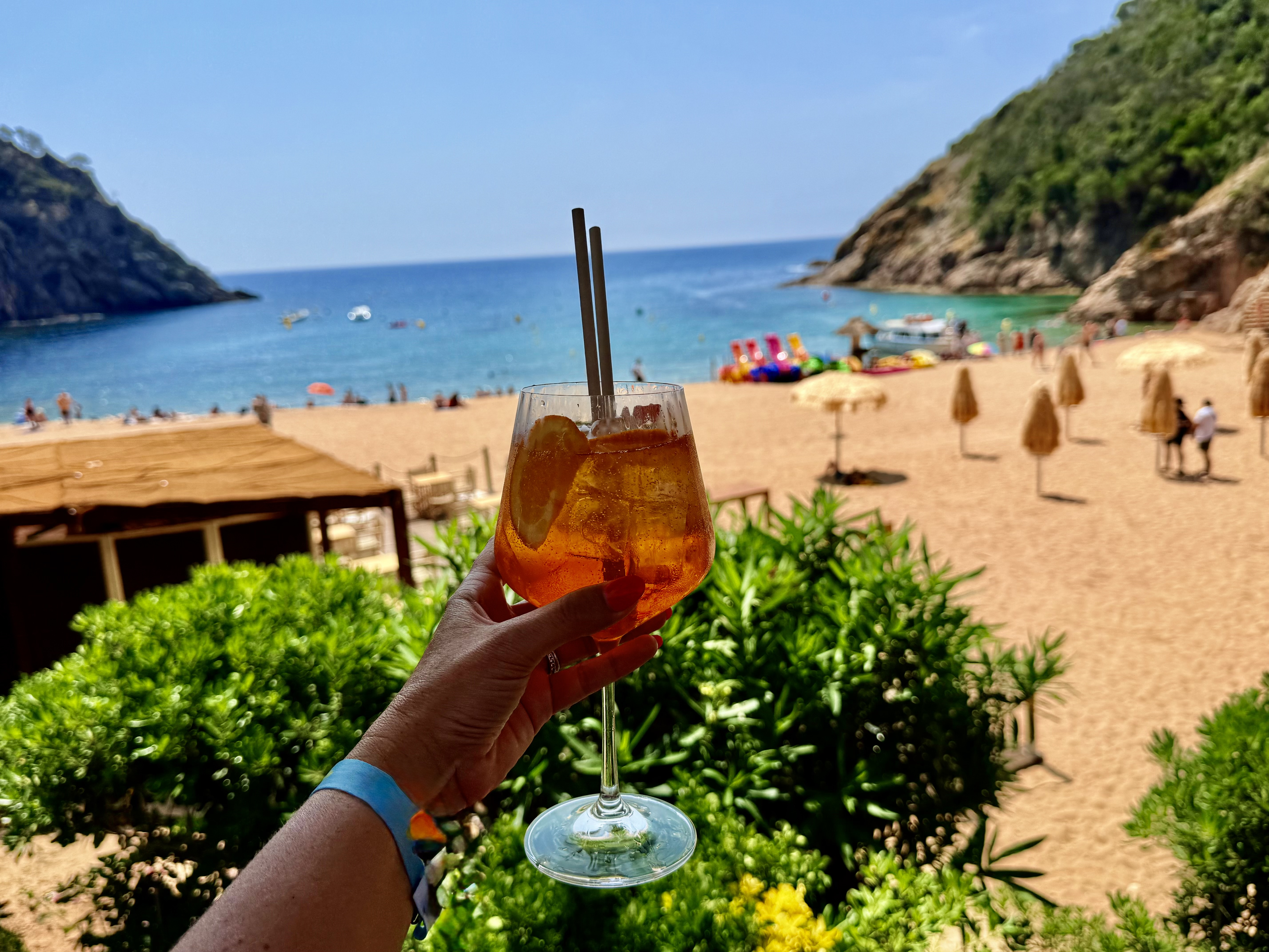 Tossa de Mar itself is rich with history, anchored by its medieval fortress, Vila Vella, which rises above the beach and dates back to the 12th century. Walking along the sand with the stone walls and towers above you really gives you a sense of how old and layered this place is—history and beach life beautifully coexisting. We stopped for drinks at Don Juan, where sipping cocktails while looking up at cured meats hanging from the ceiling felt like one of those classic, only-in-Spain moments. We also loved Els Banys Claudi, a laid-back spot right on the sand where you can sit steps from the water and watch the boats come and go.