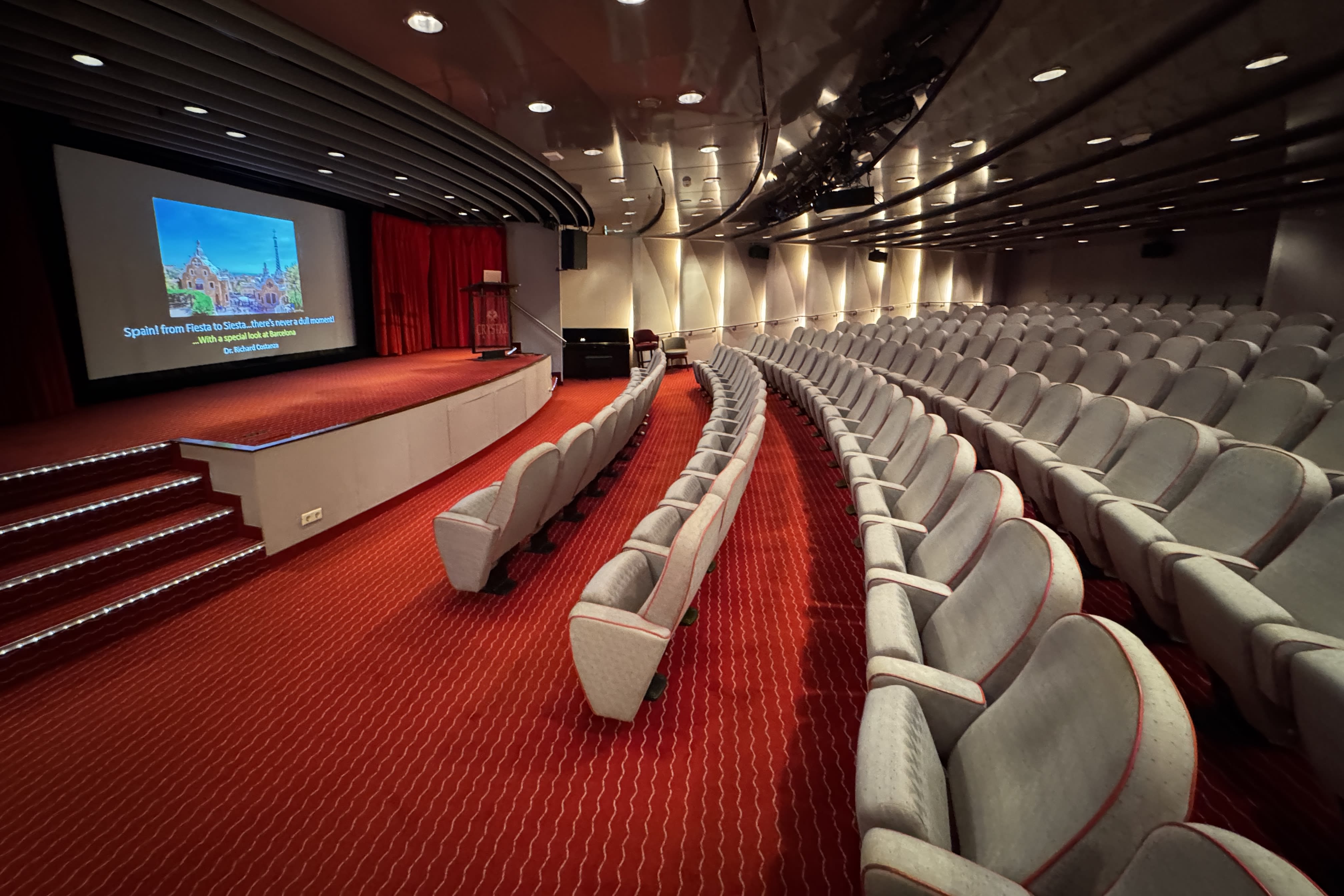 Thanks to its generous public spaces, Crystal Serenity offers unique facilities like the Computer University at Sea, with complimentary tech classes, and the Hollywood Theatre, which doubles as a lecture hall and cinema—screening relevant films like Conclave during my sailing.