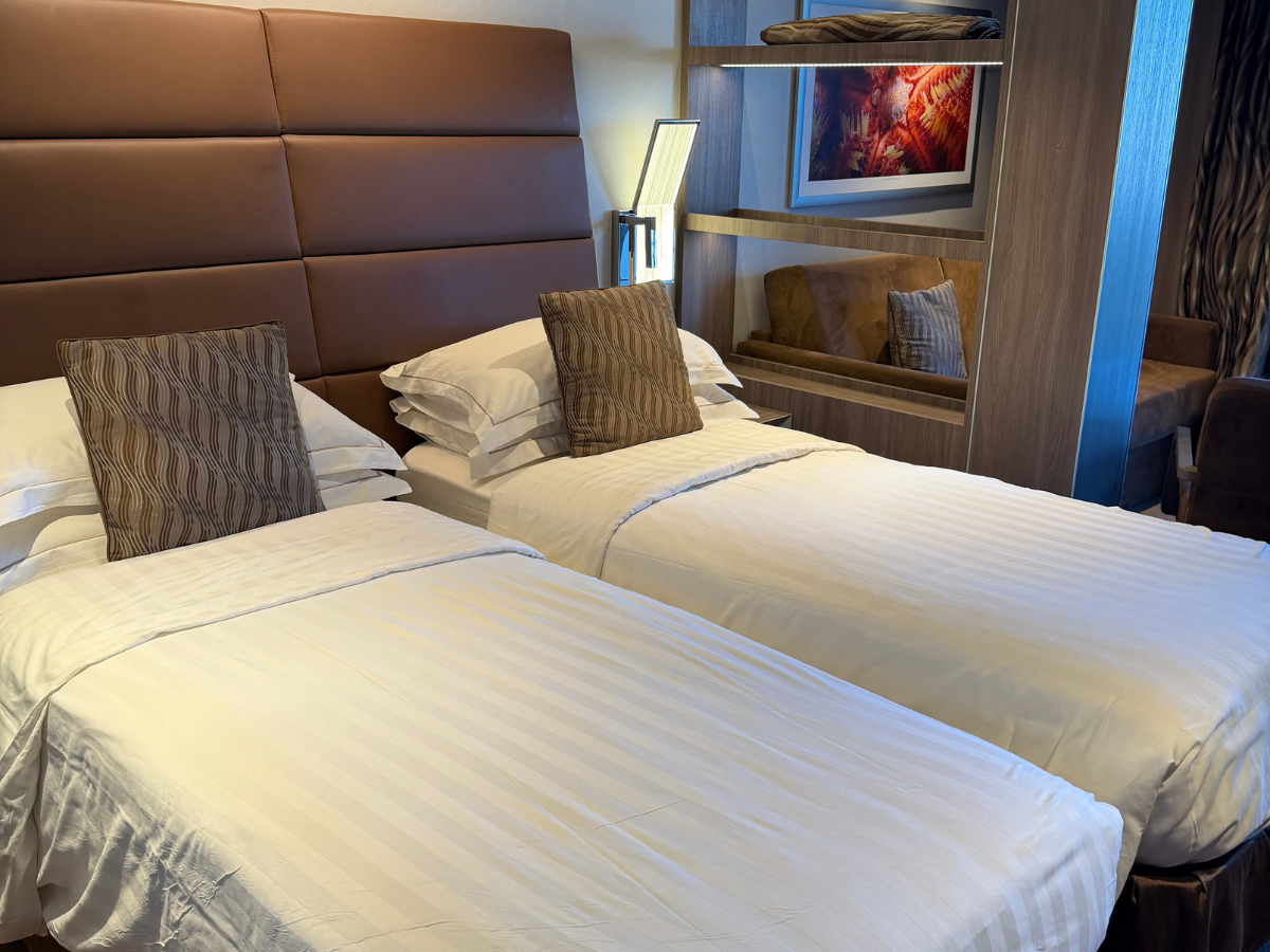 Our YC1 Yacht Club Deluxe Suite on Deck 16 was perfectly designed for the two of us with twin beds, a sitting area with a couch and table, a generous bathroom with lovely finishes, and a nice balcony, all with more than enough storage and space for a mother and adult daughter to share comfortably without ever feeling on top of each other.