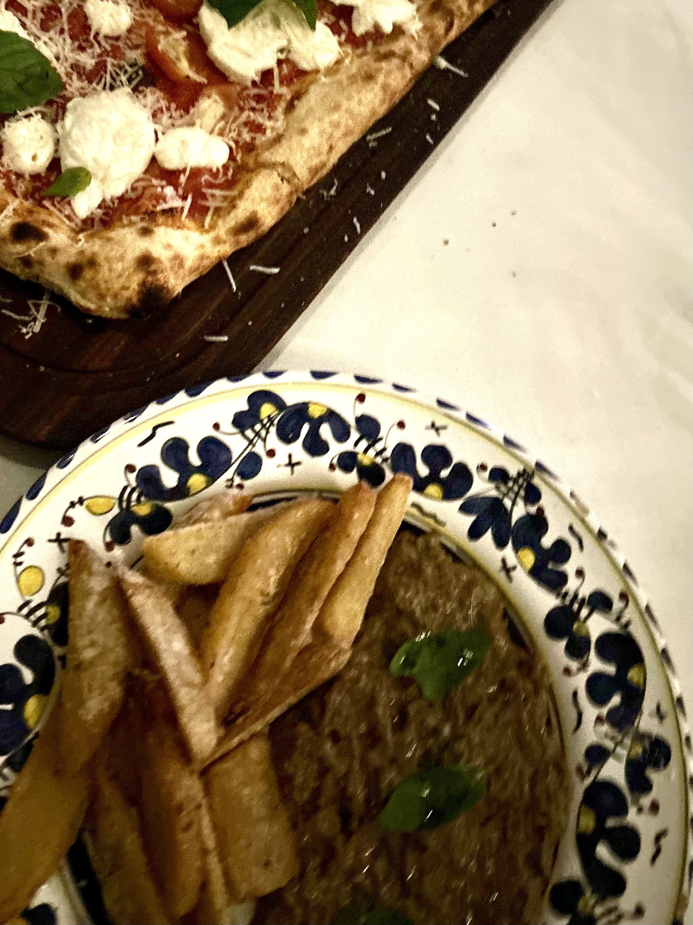 Steak tartare alla Italiana flanked by classic margherita pizza at Filomena