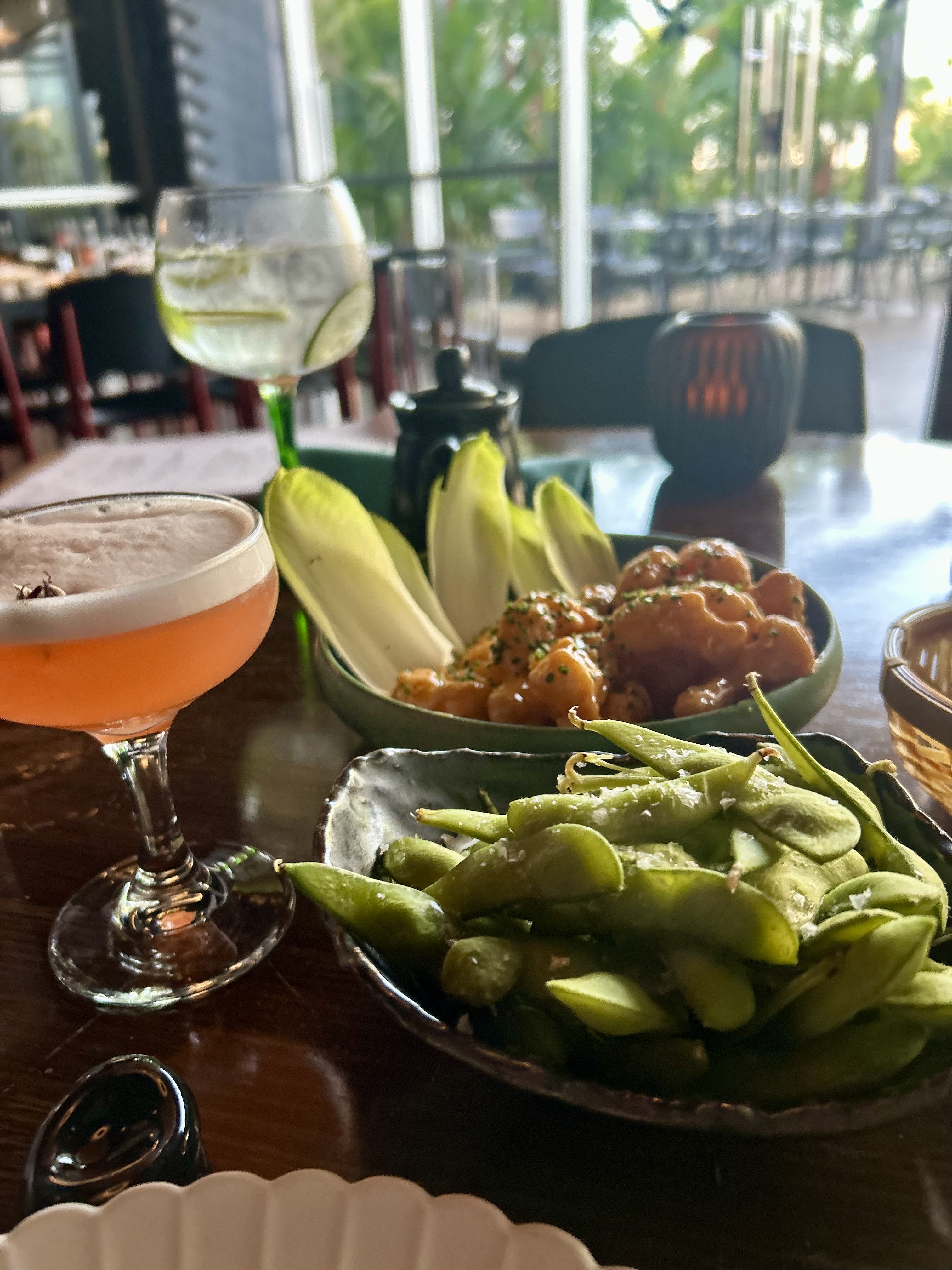 Shrimp tempura and edamame appetizers with cocktails at Makoto