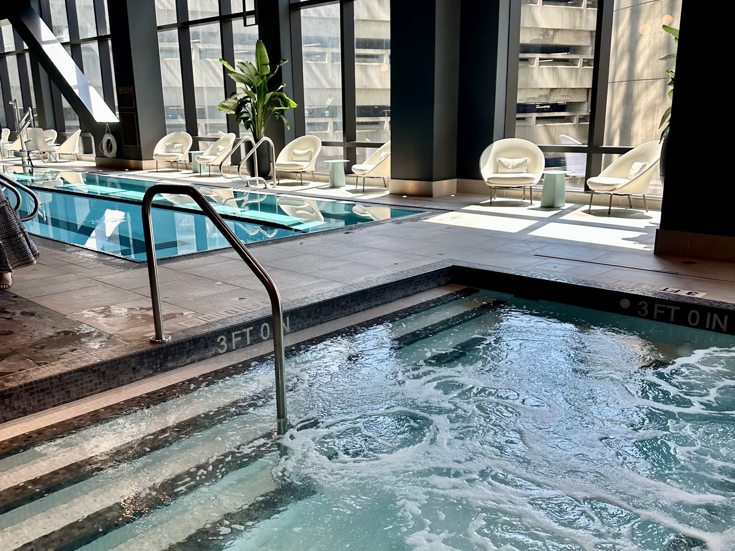 The wellness area, located on the fourth floor, was well appointed with a wonderful, large lap pool, a hot tub, and high-end gym equipment. The space was surprisingly expansive considering the urban setting. The signature Guerlain Spa is intimate, with four service rooms.