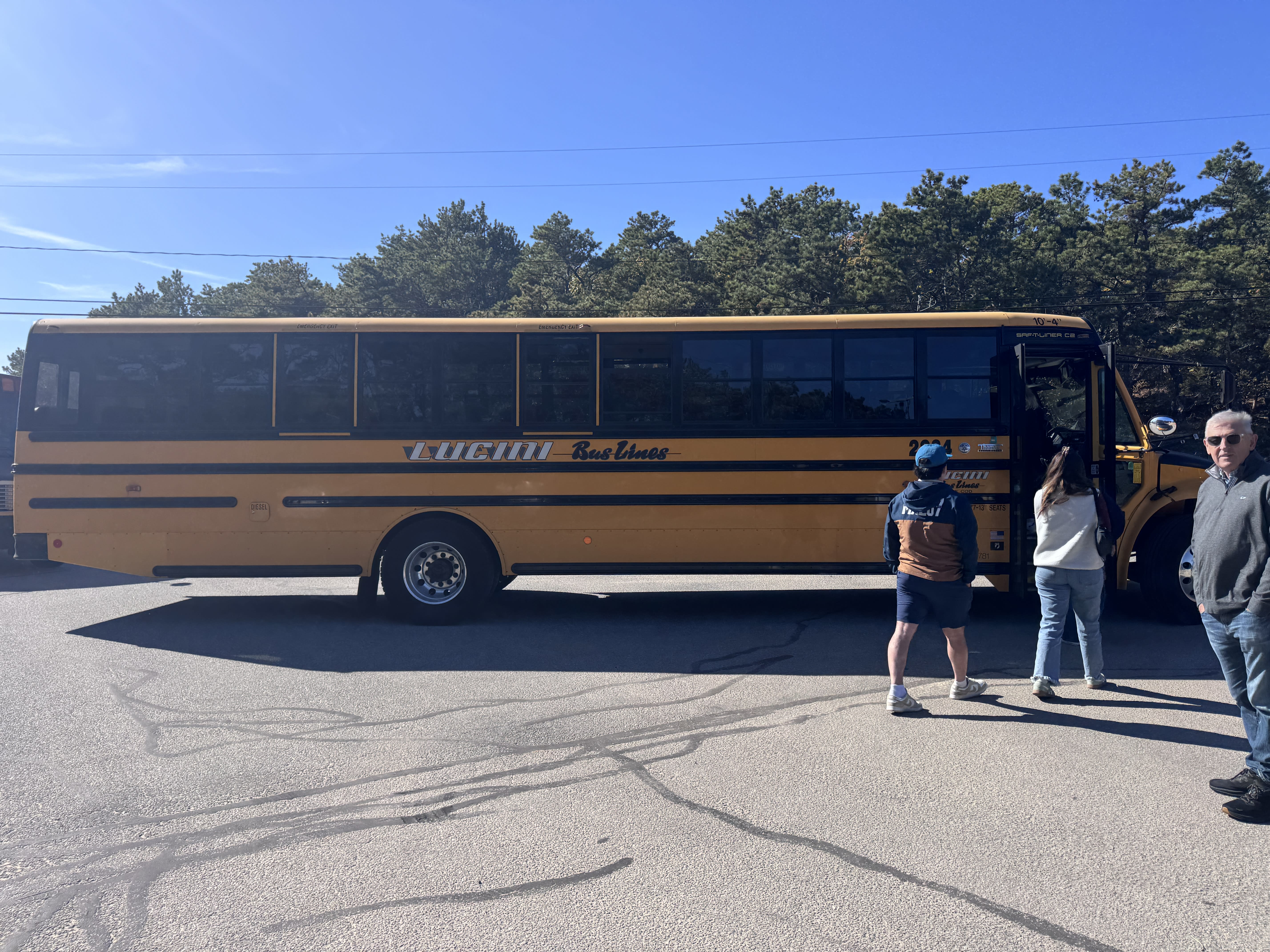 Yellow school buses shuttle festival-goers from beach parking to downtown
