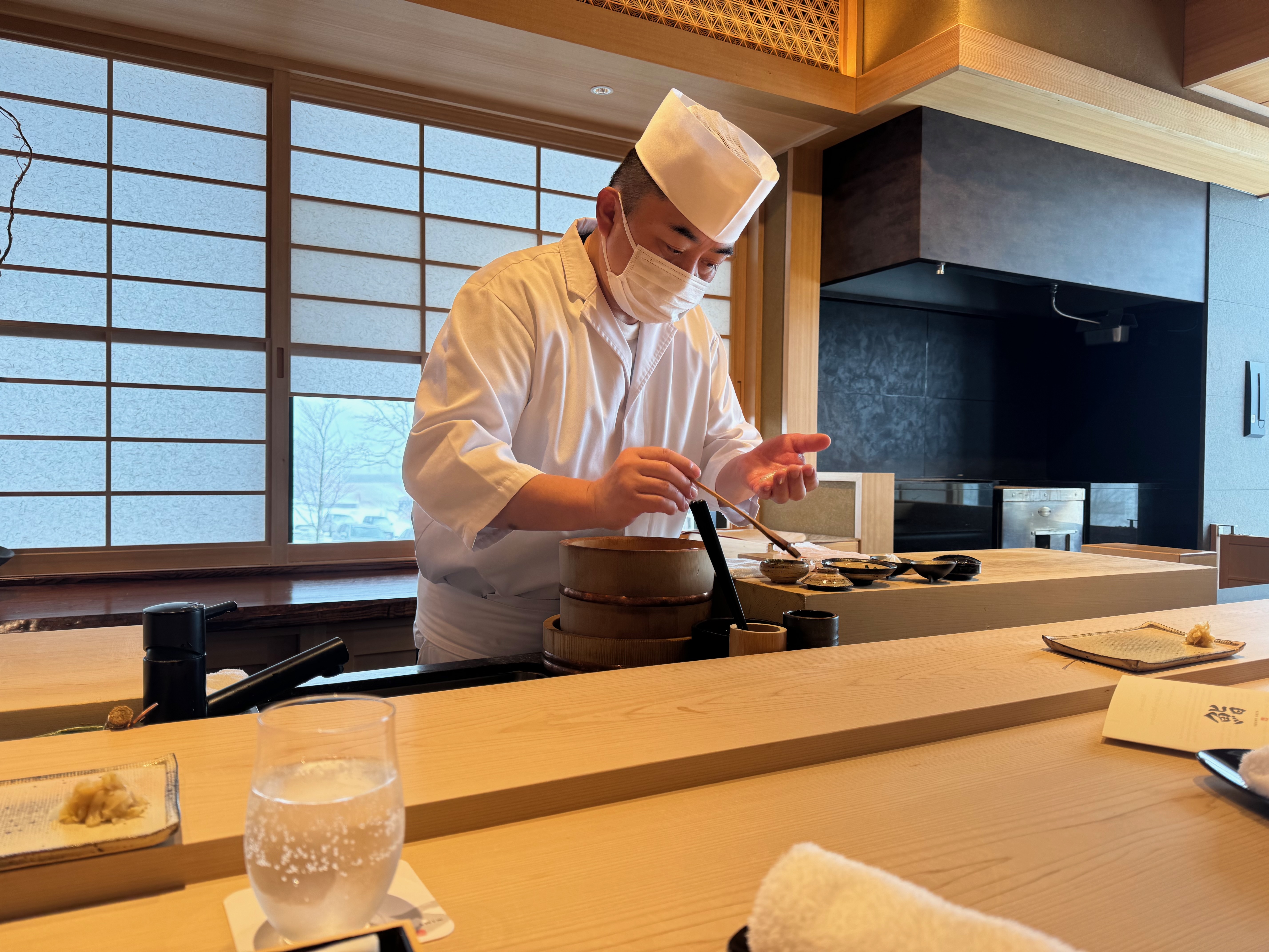 The hotel concierge had a lovely list of restaurants nearby and made reservations for my husband’s Leap Day Birthday, (apparently very lucky!) at Rin in Niseko Village. A delightful, cozy spot, we again sat stove-side and watched dinner cooked with love.
