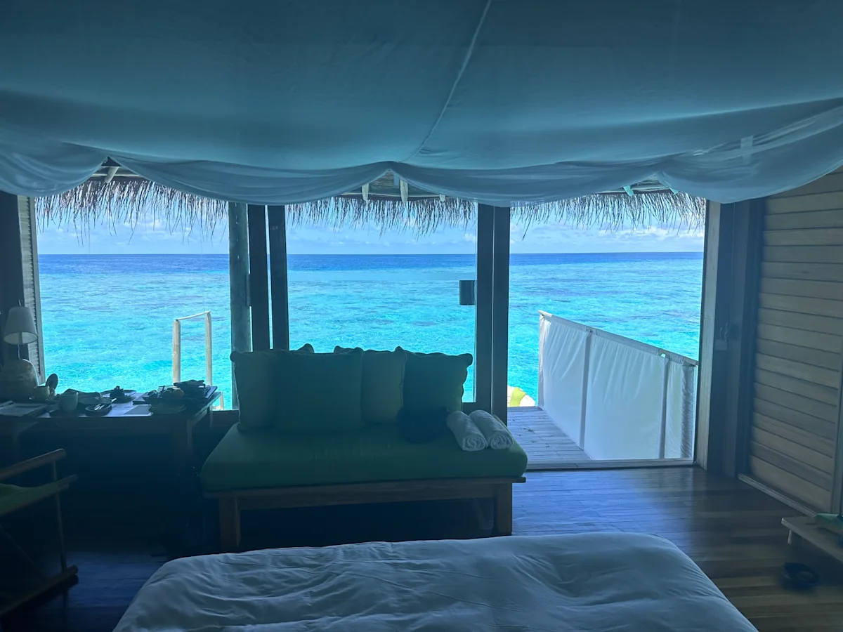 Our requested sunset room 16 on jetty A had a spectacular and unobstructed multicolored turquoise sea view similar to Vakkaru #245, Milaidhoo #109 and Amilla #126. It's the best Sunset Laamu water villa along with room 15. The two rooms after ours were 17 and 18 and the only difference besides a price increase is a pool, which is not a deal breaker for us as we spend a-lot of time in the warm ocean. Plus, there is a lovely resort pool available. The design of the room has such an incredible ambiance being made of all natural materials. The sink is made out of leather, there is a fabulous rain shower outside, a nice second story open loft area to lounge in and a large deck with a perfect place to cozy up to at night to watch the shooting stars. There is no light pollution, so the night sky is unbelievably starry! It's magical to sit in the cushioned seating area by the water completely open to the night sky above, and it's really quiet at Six Senses, which, combined with a relaxing atmosphere, makes it one of our favorites.