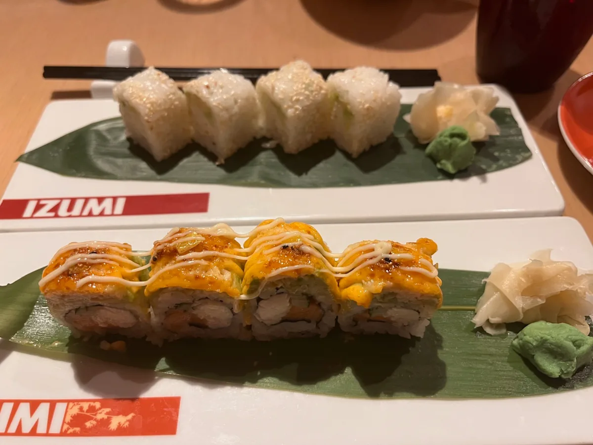 On a Royal Caribbean cruise, you could just pay your cruise fare and not pay another dime. But, of course, there are many a la carte options, shopping, drinks, etc. that you can either book ahead of time (like an unlimited drink package) or Specialty Dining - above and beyond the including venues/main dining room. Our first night, we had dinner at one of the specialty dining venues, Izumi Sushi. We have had Izumi before on other Royal Caribbean ships and it’s a favorite of ours. Grandeur only has the Izumi Sushi restaurant, and does not have the Hibachi seating. I had a delicious poke bowl and my favorite: the Ryu Futomaki Roll. If you ever go to Izumi - please try it, and think of me!